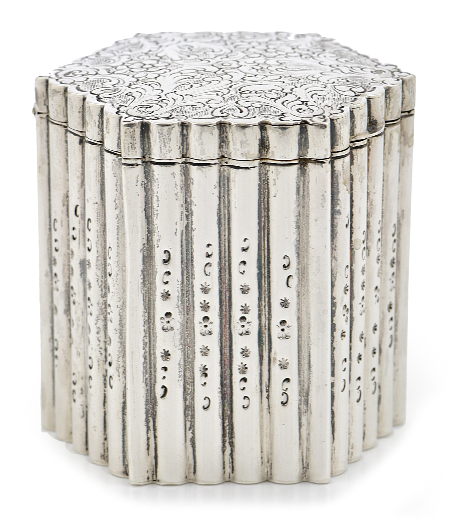 the hexagonal and lobed body with a floral and scroll engraved lid, approximately 170 gms, 7.5cm high