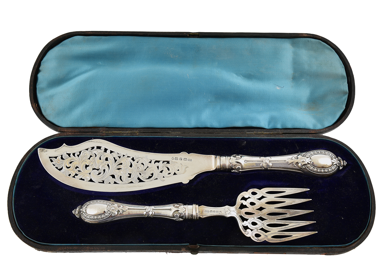 A CASED VICTORIAN SILVER FISH KNIFE AND FORK