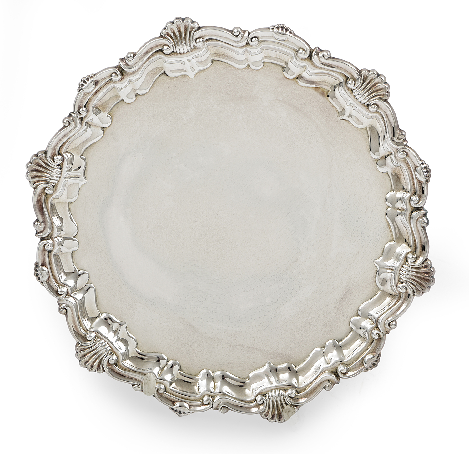 the shaped circular tray with a raised shell and scrollwork border, supported by three scroll feet, approximately 258 gms, 19 cm diameter
