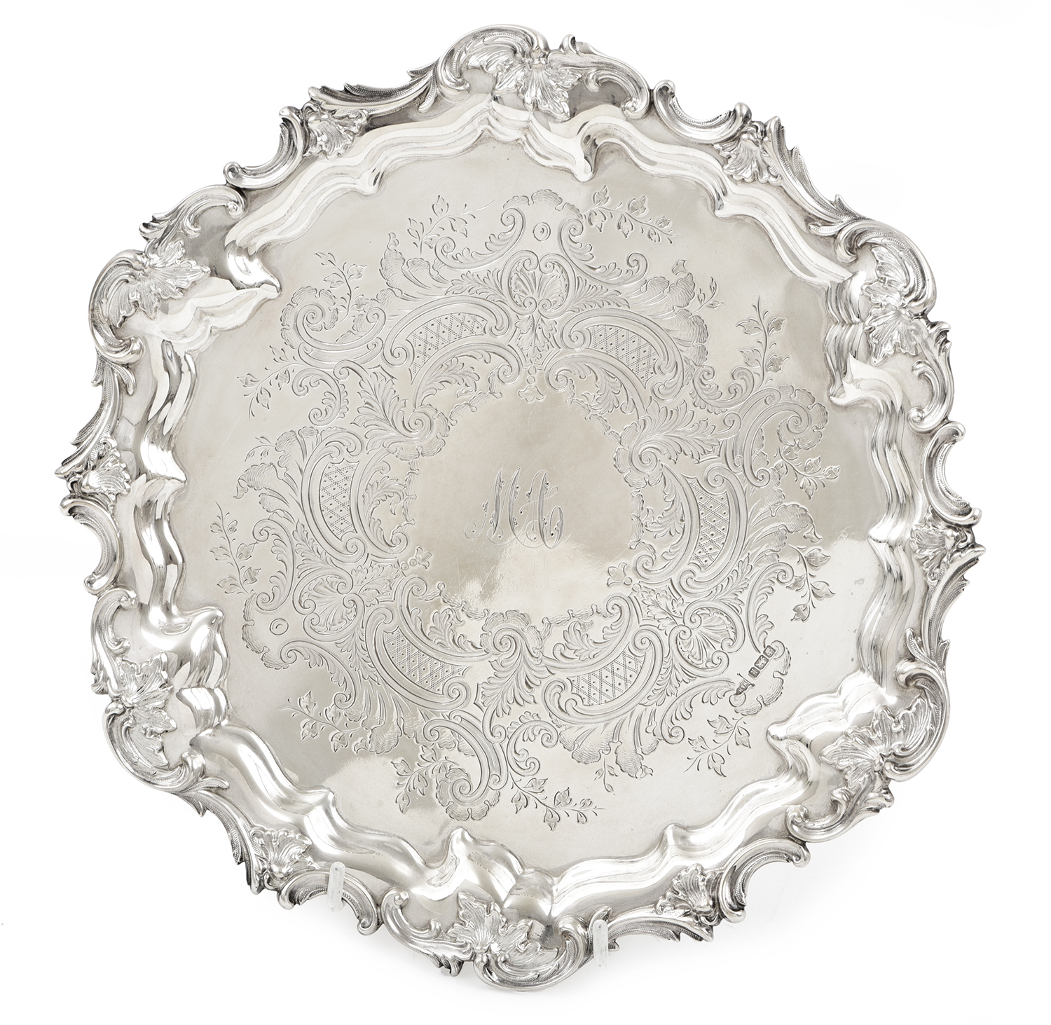the shaped circular tray with a raised foliate scrollwork border, with an engraved centre surrounding the monogram 'MA', supported by three scroll feet, approximately 568 gms, 17cm diameter