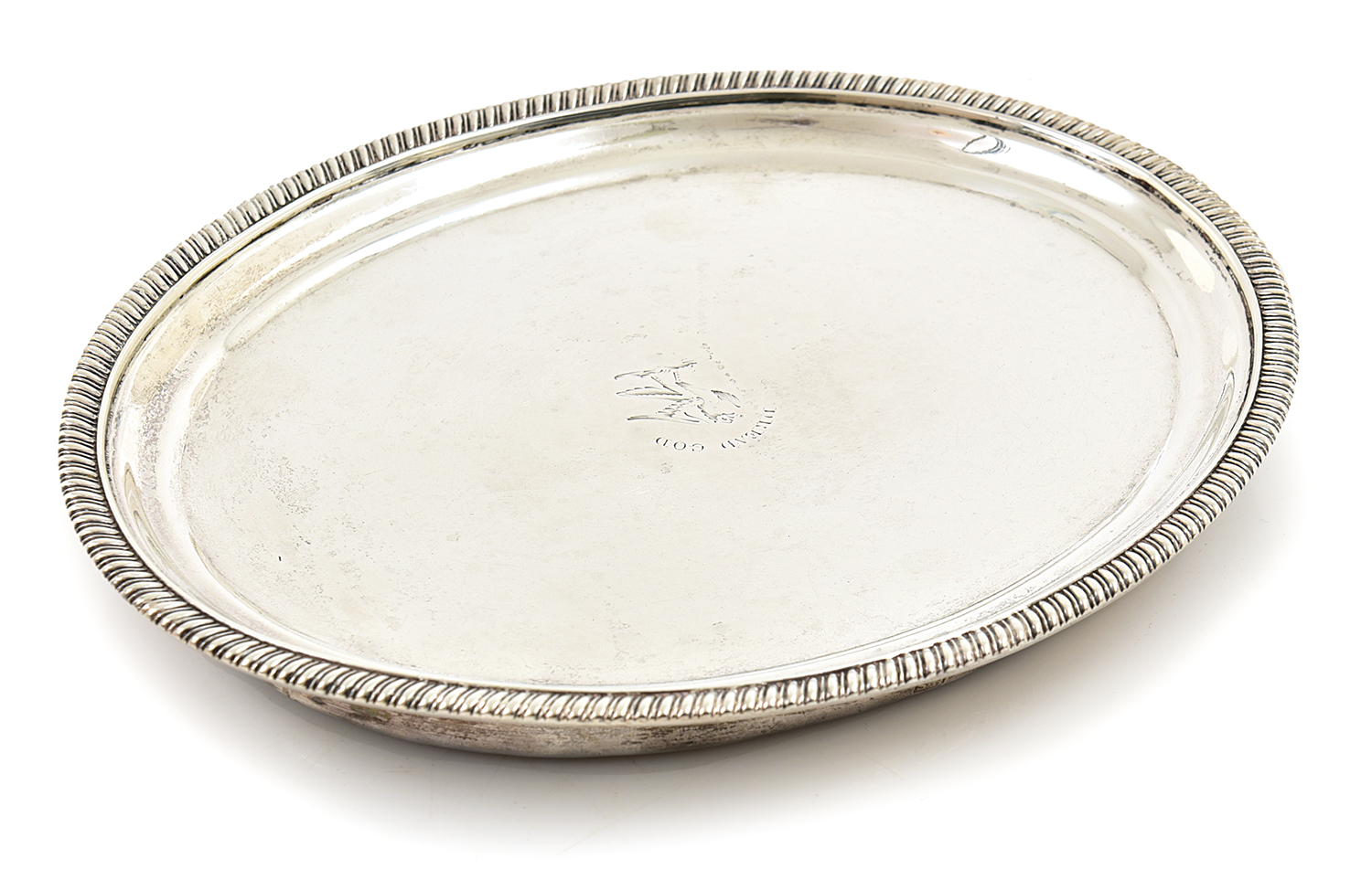 the oval trivet engraved with a central armorial crest of an eagle below the words 'DREAD GOD', mounted onto a wooden base, total weight approximately 252 gms, 15.5cm wide