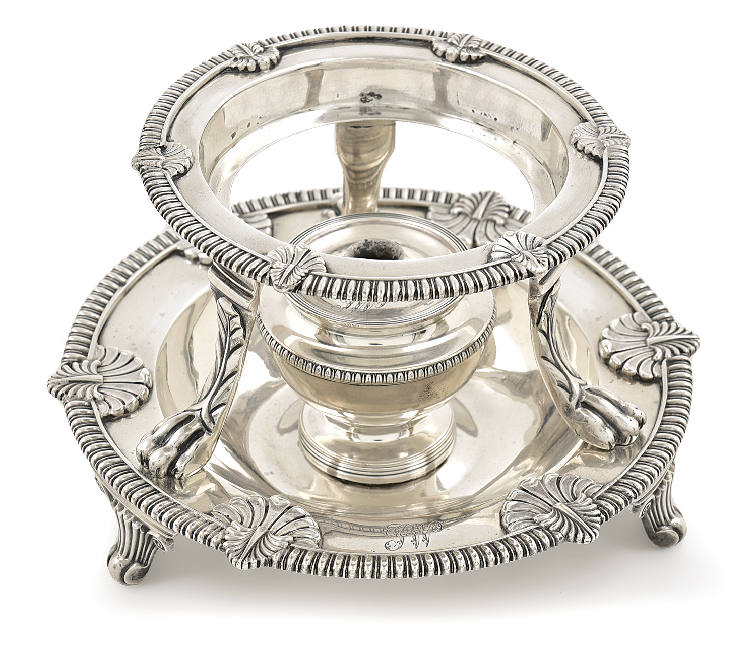 Internal dimension of rim 9.5cm diameter; overall light surface scratches; small compression to one side of burner; engraved monogram to the border and burner; burner, burner cover and the underside of the body all with conforming hallmarks