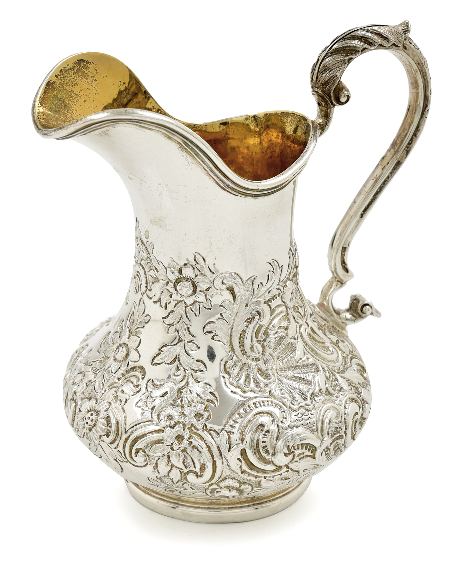 compressed circular, with heavily embossed floriate decoration beneath an oversized fluted spout and a scrolled handle, approximately 280 gms, 13.5cm high