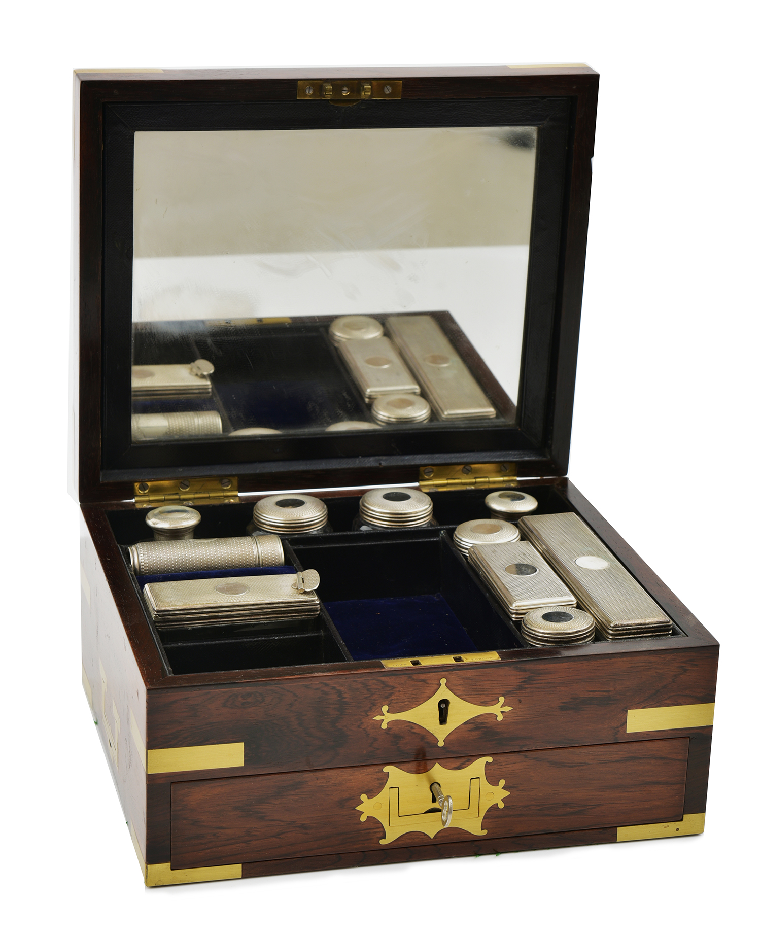 the vanity box with cut brass detail, the fitted blue velvet and leather interior containing five silver plate canisters, two silver plate bottles and two rectangular boxes, above a single drawer, 14.5 x 30.5 x 25.5 cm