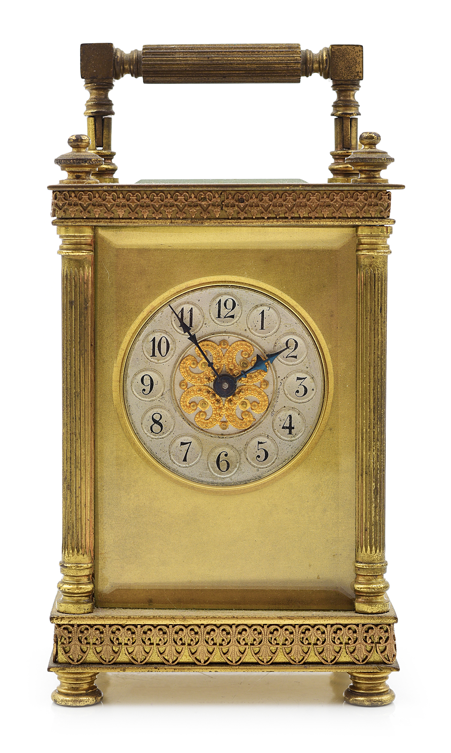 designed with a matching brass back plate and silvered dial, single barrel movement, total height 15cm