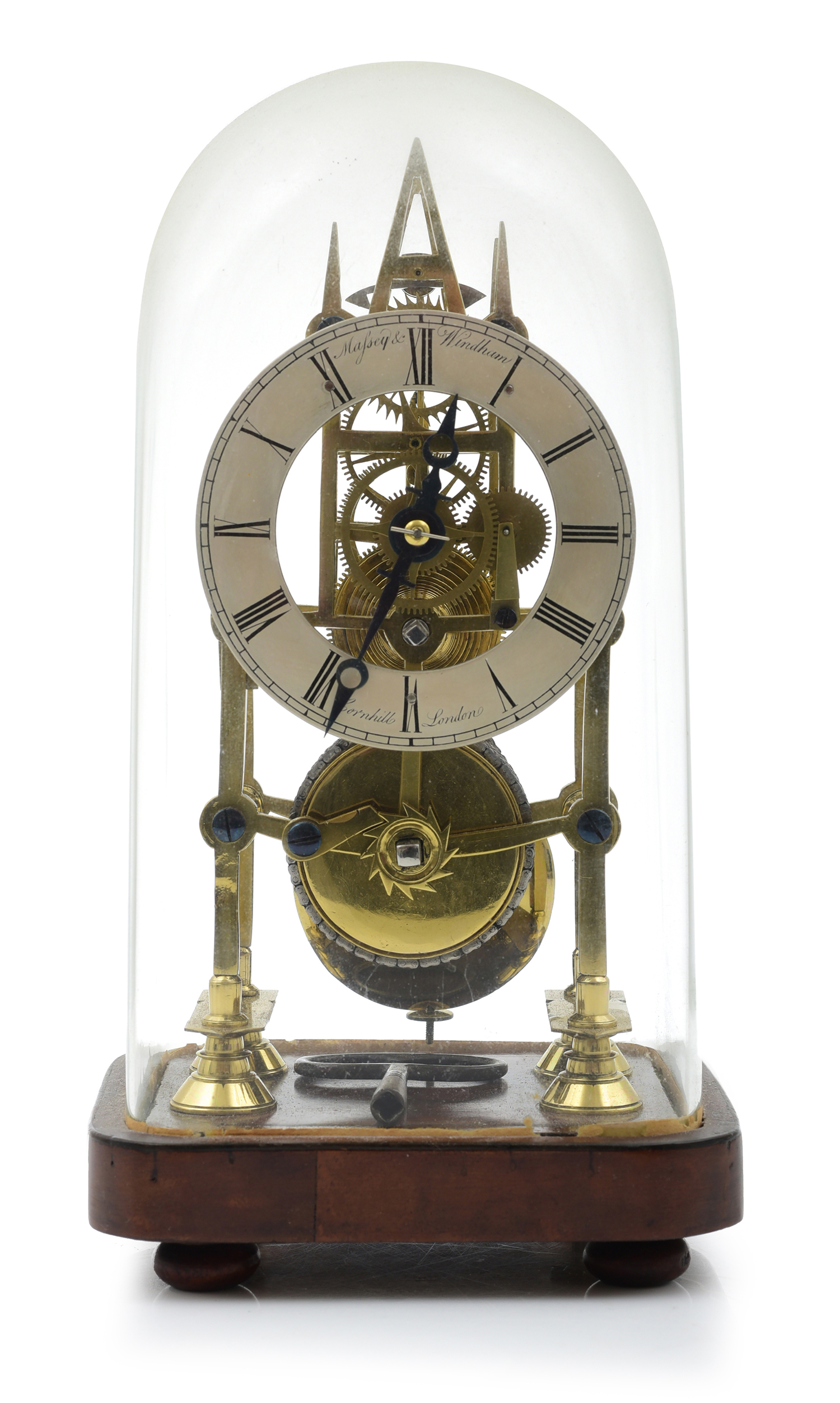 the cathedral inspired openwork brass clock with single fusee barrel and chain movement, housed under a rectangular glass dome, 27cm total height