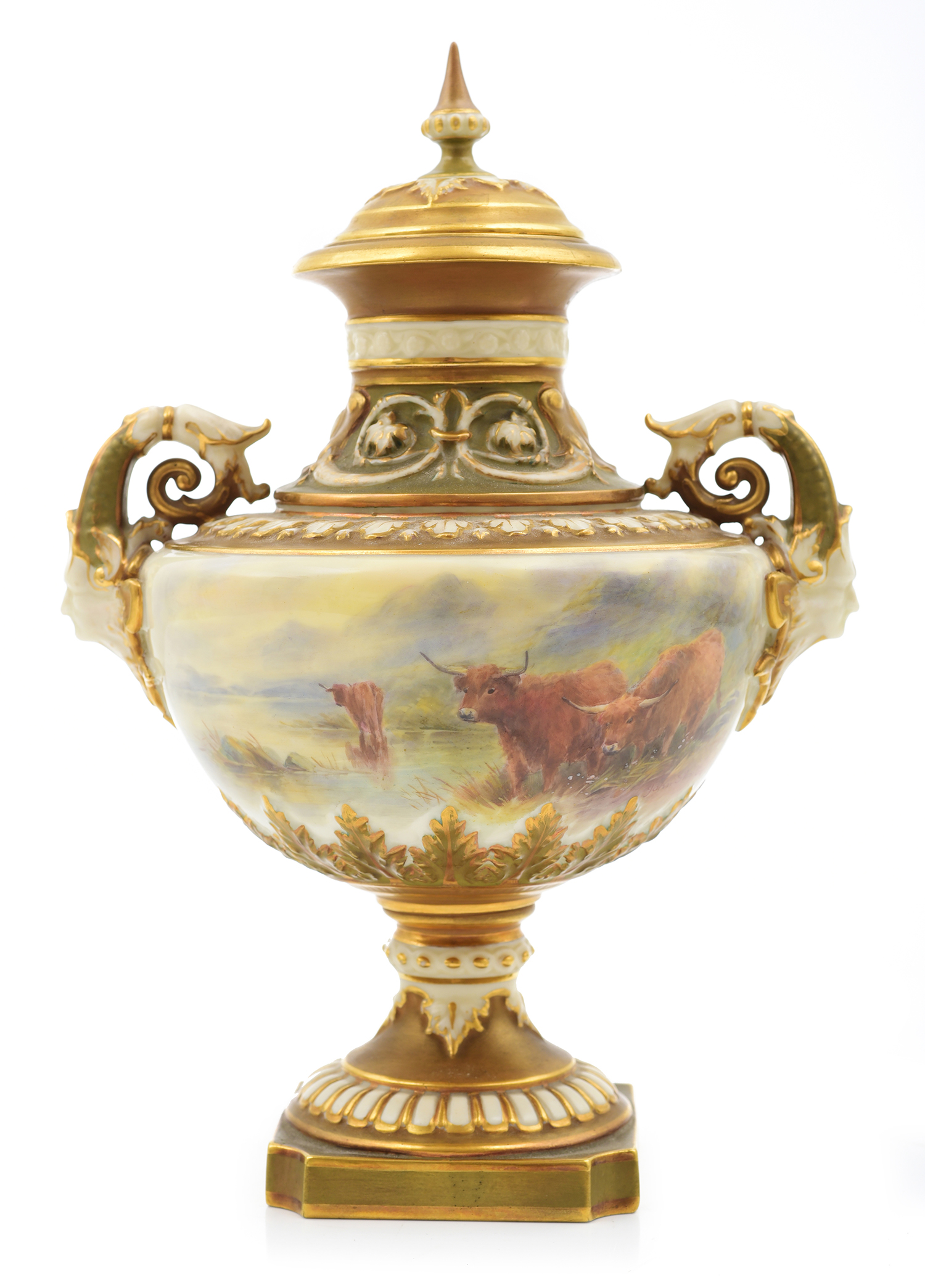 compressed circular in form, hand painted with a highland cattle scene, signed by the artist, with two figural scroll handles, seated on a pedestal foot, puce factory mark to base, model no. 1572, 27cm high
