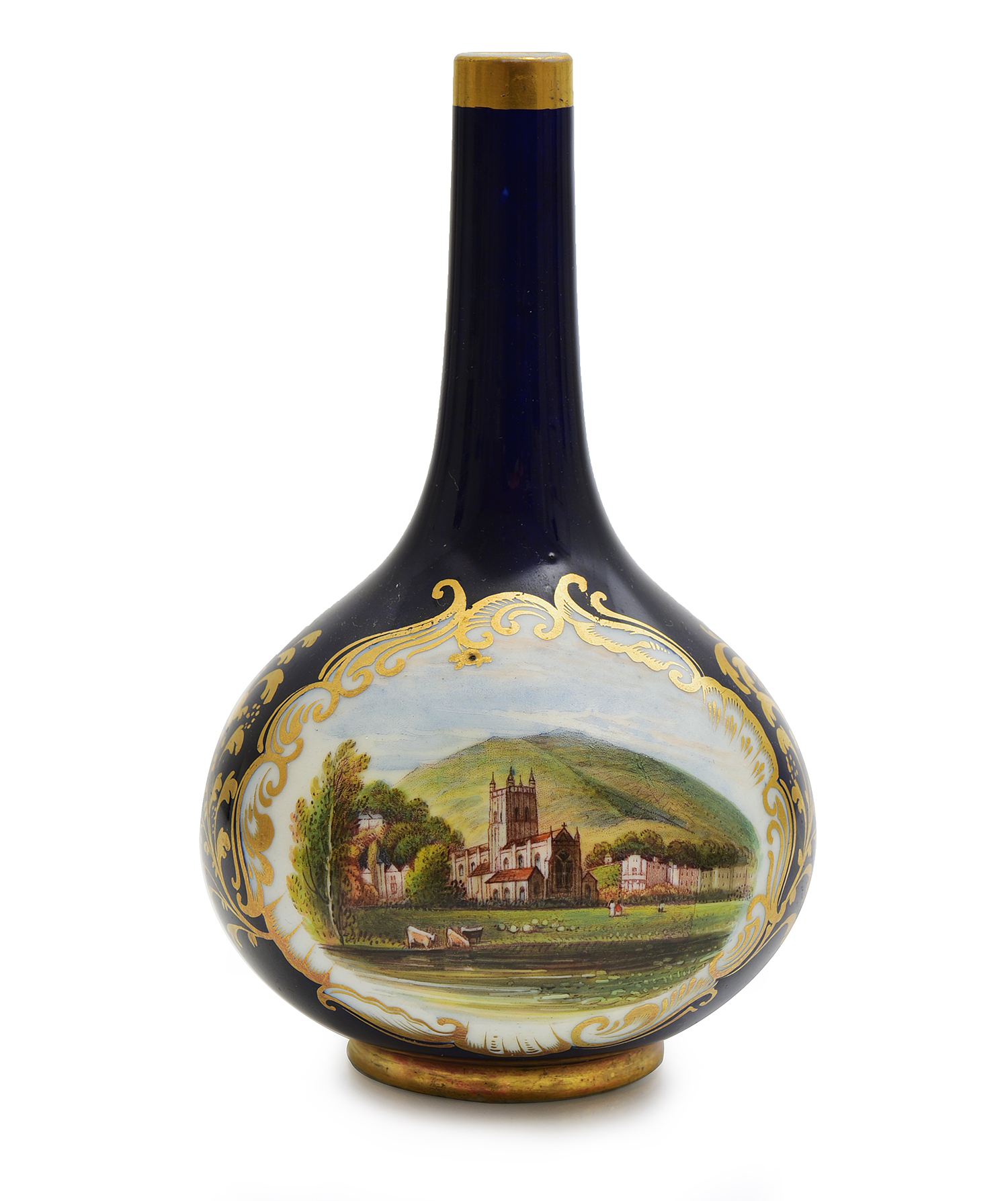 compressed in form, finely painted with a scene of 'Malvern', on a cobalt blue ground with gilded highlights, marked Chamberlain's Worcester, Malvern to base, 13cm high