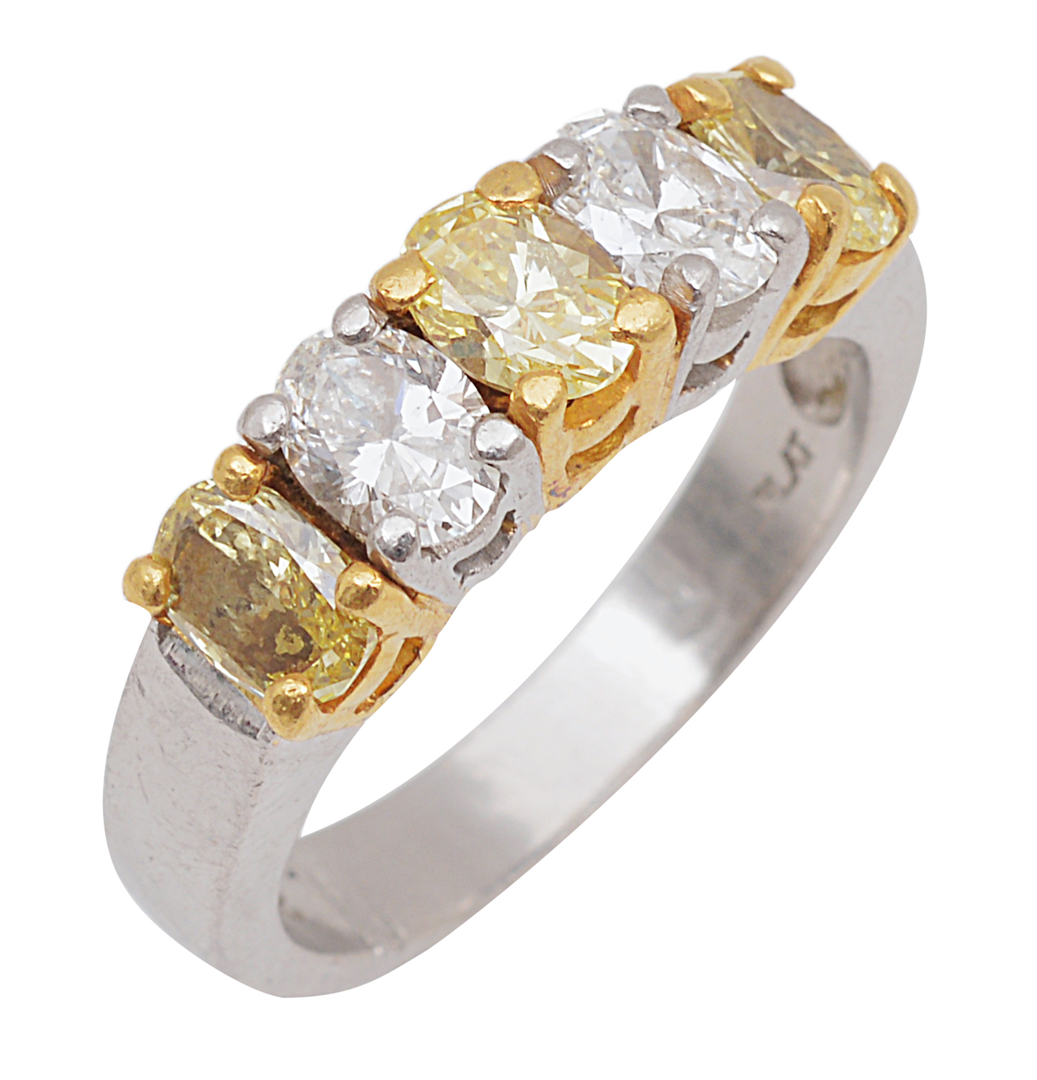 Comprising three oval yellow diamonds totalling 1.20cts, interspaced with oval cut white diamonds totalling 0.80cts, mounted in platinum and 22ct gold, ring size P.