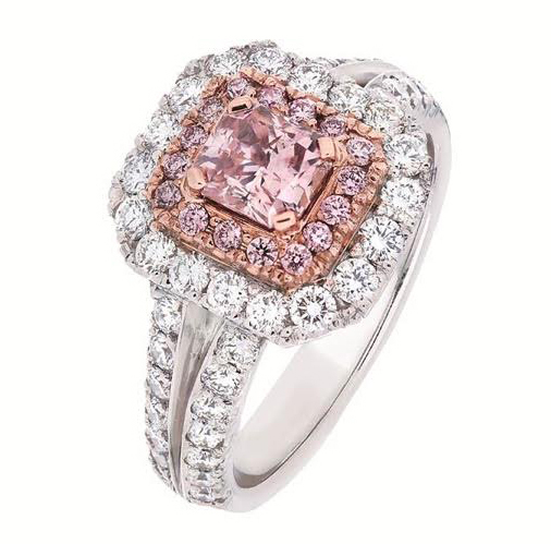 The radiant cut pink diamond of 0.62cts, accompanied by Argyle Diamonds Certificate number 350742, colour PC2, clarity P1, surrounded by sixteen round brilliant cut pink diamonds totalling 0.13cts, all within a boarder of eighteen white diamonds, further diamonds detail to shoulders, all mounted in 18ct white and rose gold.