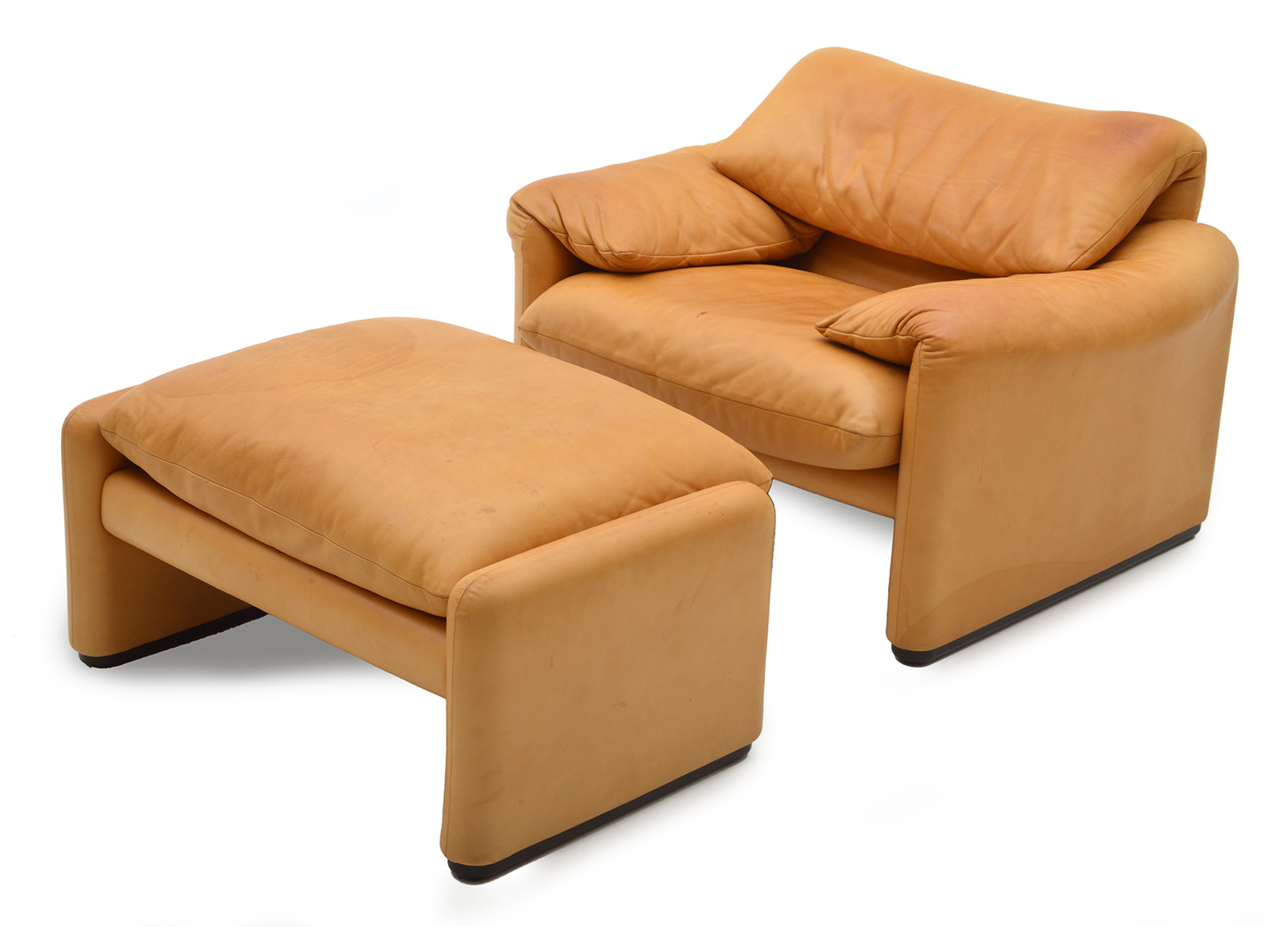 The Maralunga is in good condition, all the mechanisms are in perfect order and the leather is sof and subtle. It does have a few stains on the chair, and a large stain on the ottoman. I do believe with a leather treatment some of these stains cld be less noticeable.