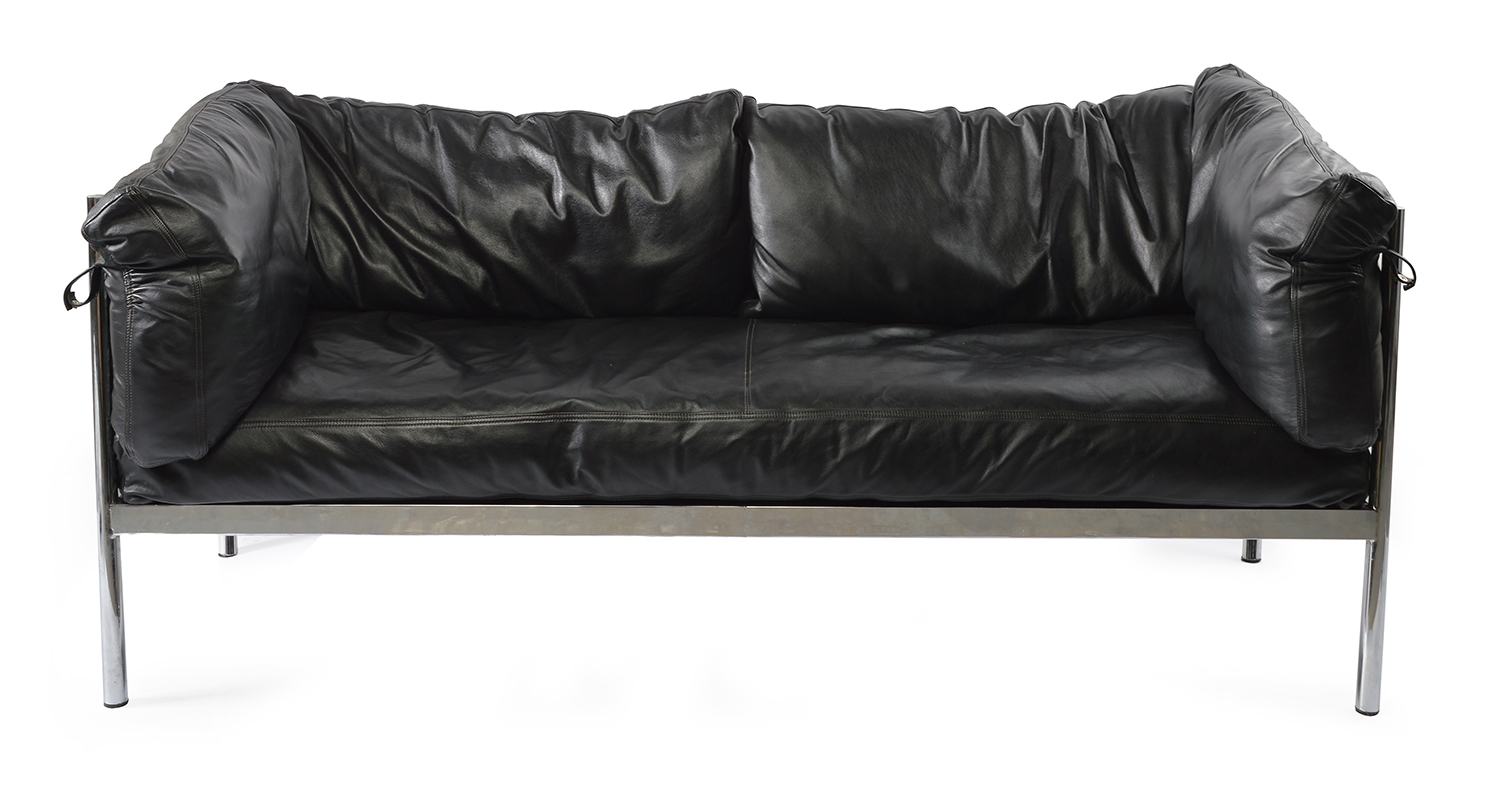 The leather upholstery on the sofa cushions is in very good condition. The cushions still hold a good shape, but one of the buttoned attaching loops has detached from the back of one cushion. Chrome frame and webbing in very good condition.