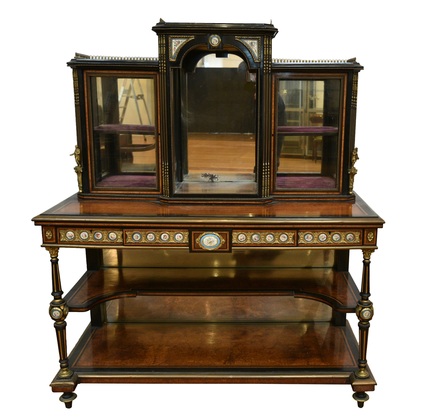 the upper structure modelled in the French style, ebony and amboyna inset with a frieze of Sevres porcelain panels, and ormolu mounts depicting Milton and Shakespeare, 134cm x 59cm x 92cm