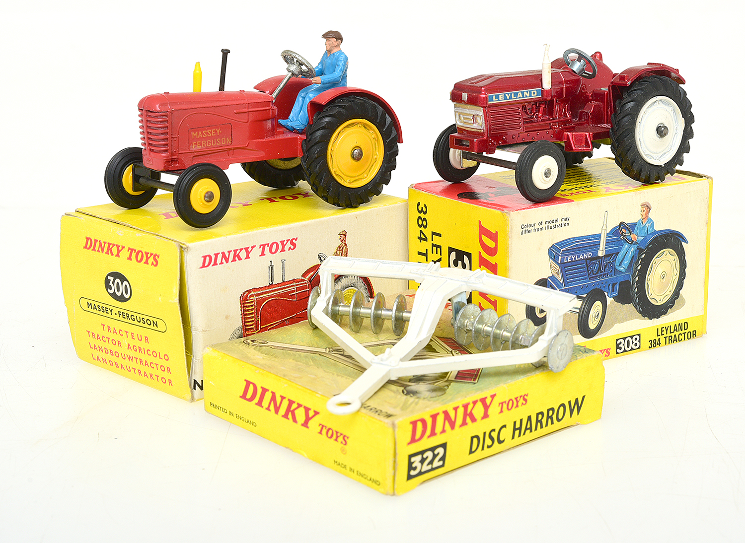 3 X BOXED DINKY MODELS INCLUDING NO. 308 LEYLAND 384 TRACTOR; NO. 300 MASSEY-FERGUSON TRACTOR; AND NO. 322 DISC HARROW (VG - E BOXES VG - E) (3)