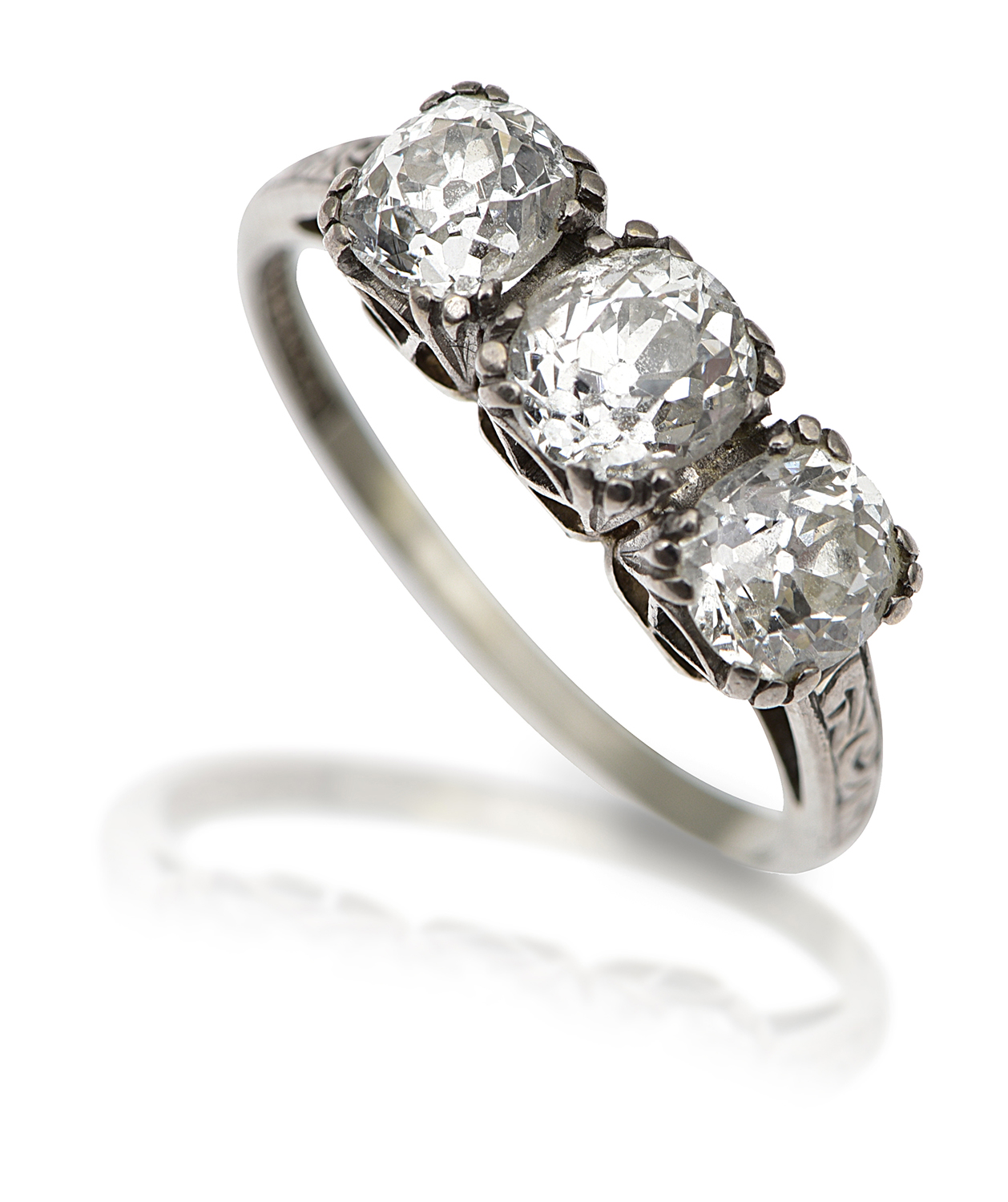 Comprising three cushion shaped old European cut diamonds totalling 1.63cts, mounted in 18ct white gold, signed, ring size M.