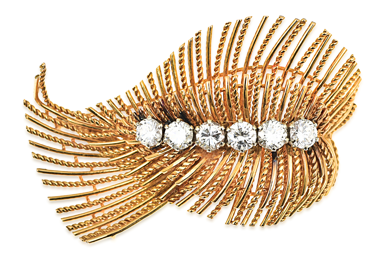 Featuring six round brilliant cut diamonds totalling 1.50cts, above stylised wirework leaves, mounted in 14ct gold.
