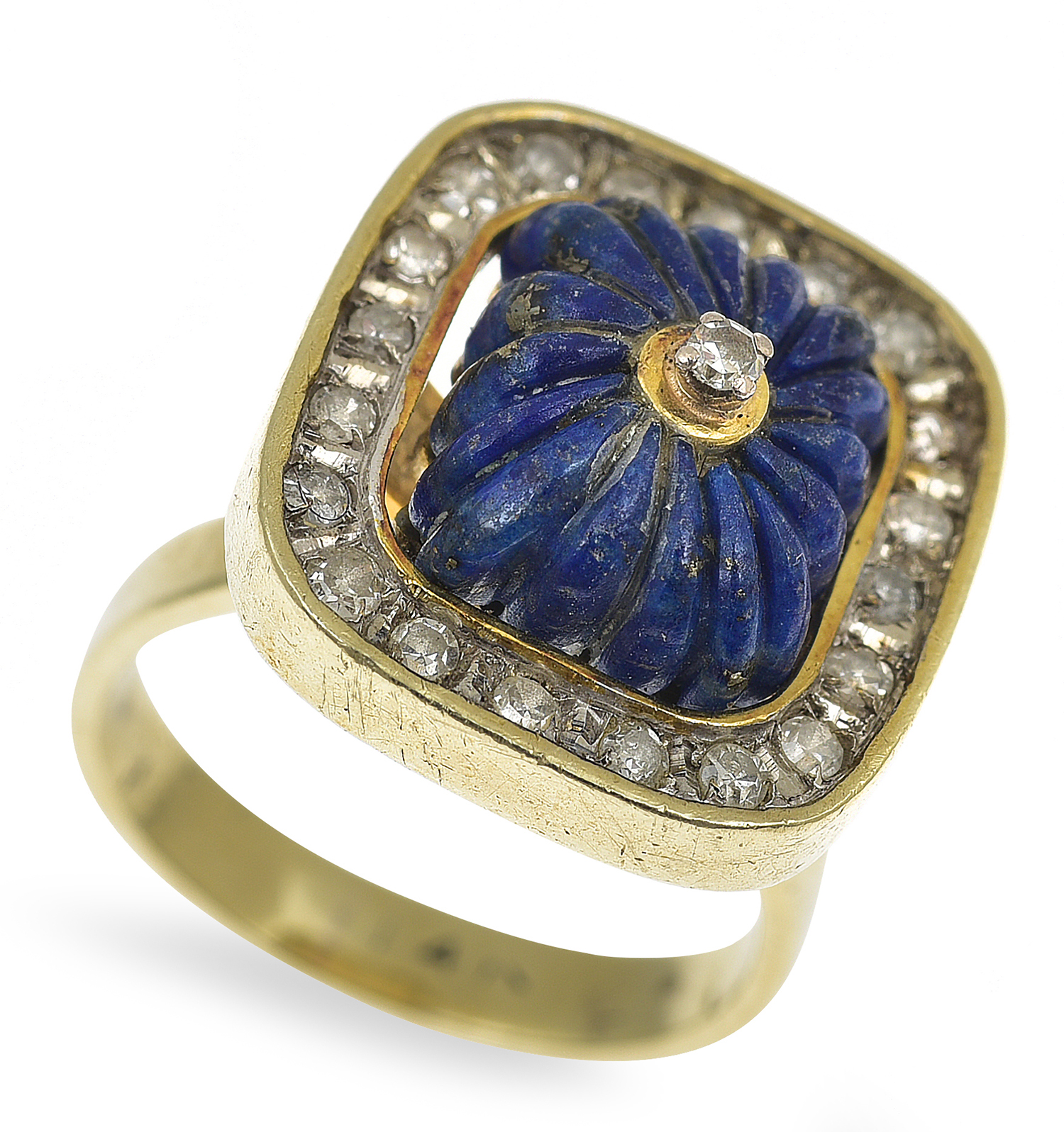 Featuring a fluted panel of lapis lazuli centrally set with a single cut diamond, having further diamonds set to the pierced surround, mounted in 14ct gold, ring size F.