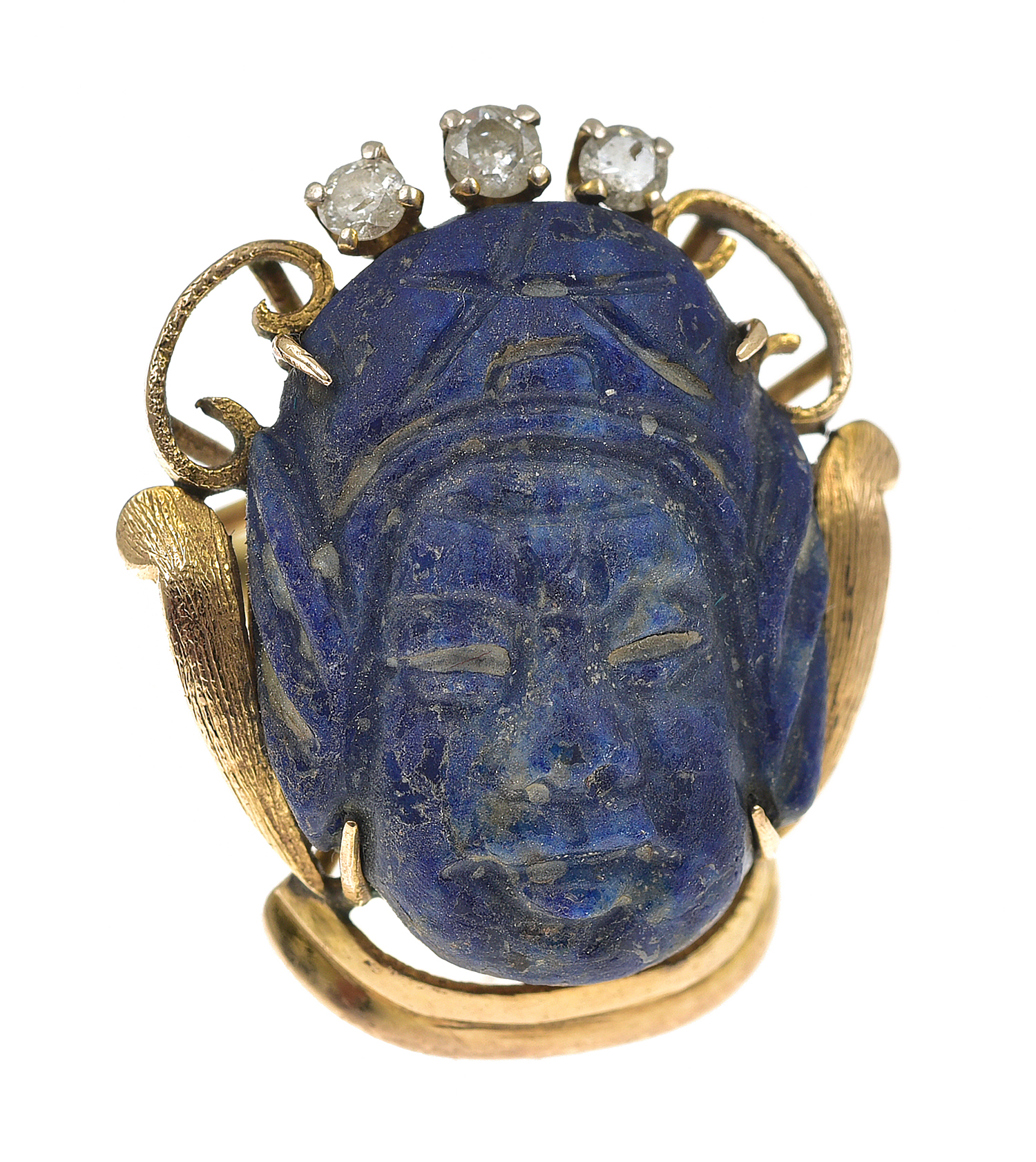 The lapis lazuli carved as a portrait, surmounted by three round brilliant cut diamonds, mounted in gold, ring size L.