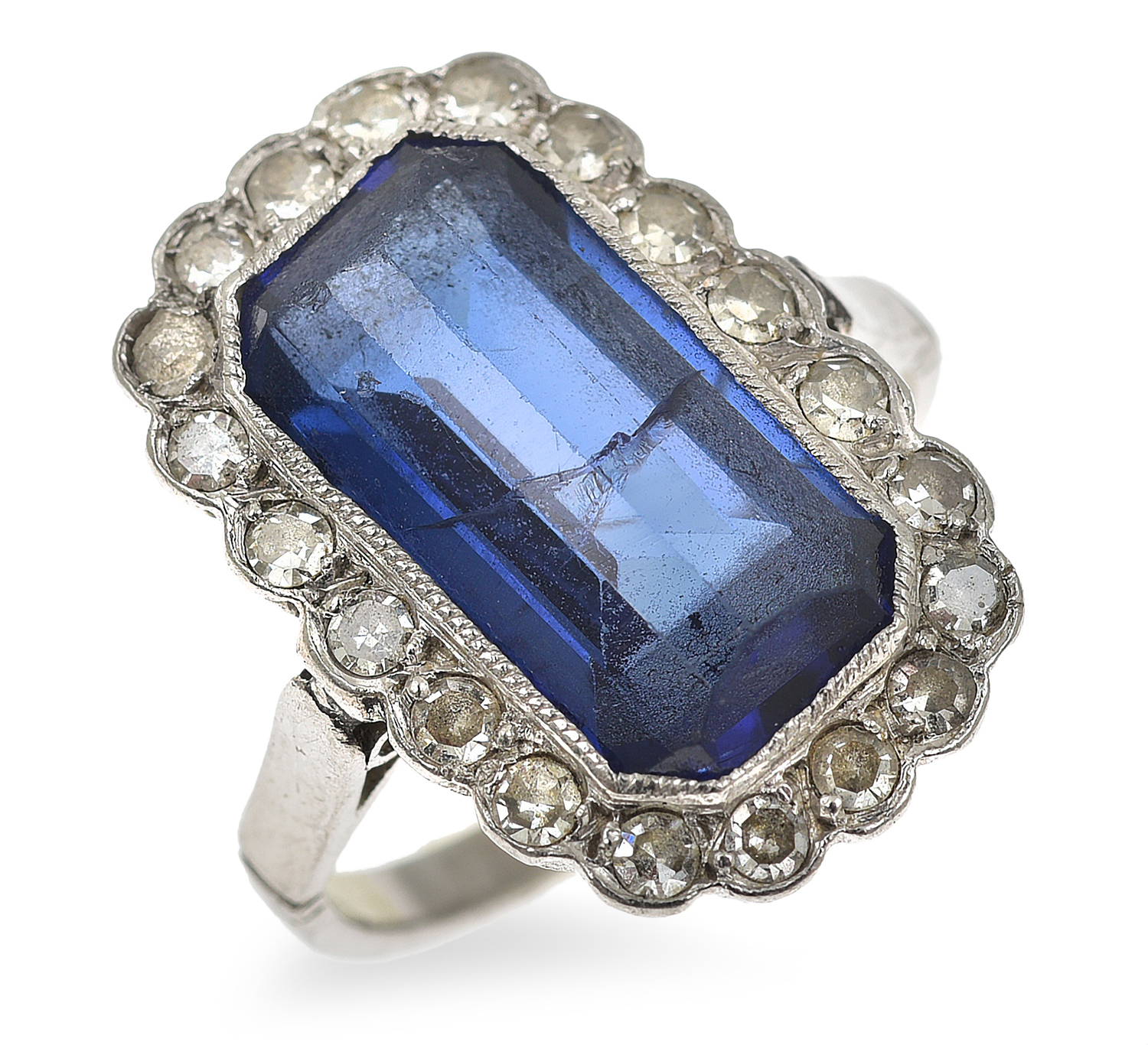 sapphire has some visible inclusions and has surface wear to the table. Shank is broken and most likely needs resizing.