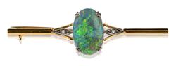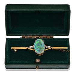 The oval semi-black opal cut en cabochon with single cut diamond detail to a bar fitting, mounted in 18ct gold and platinum.