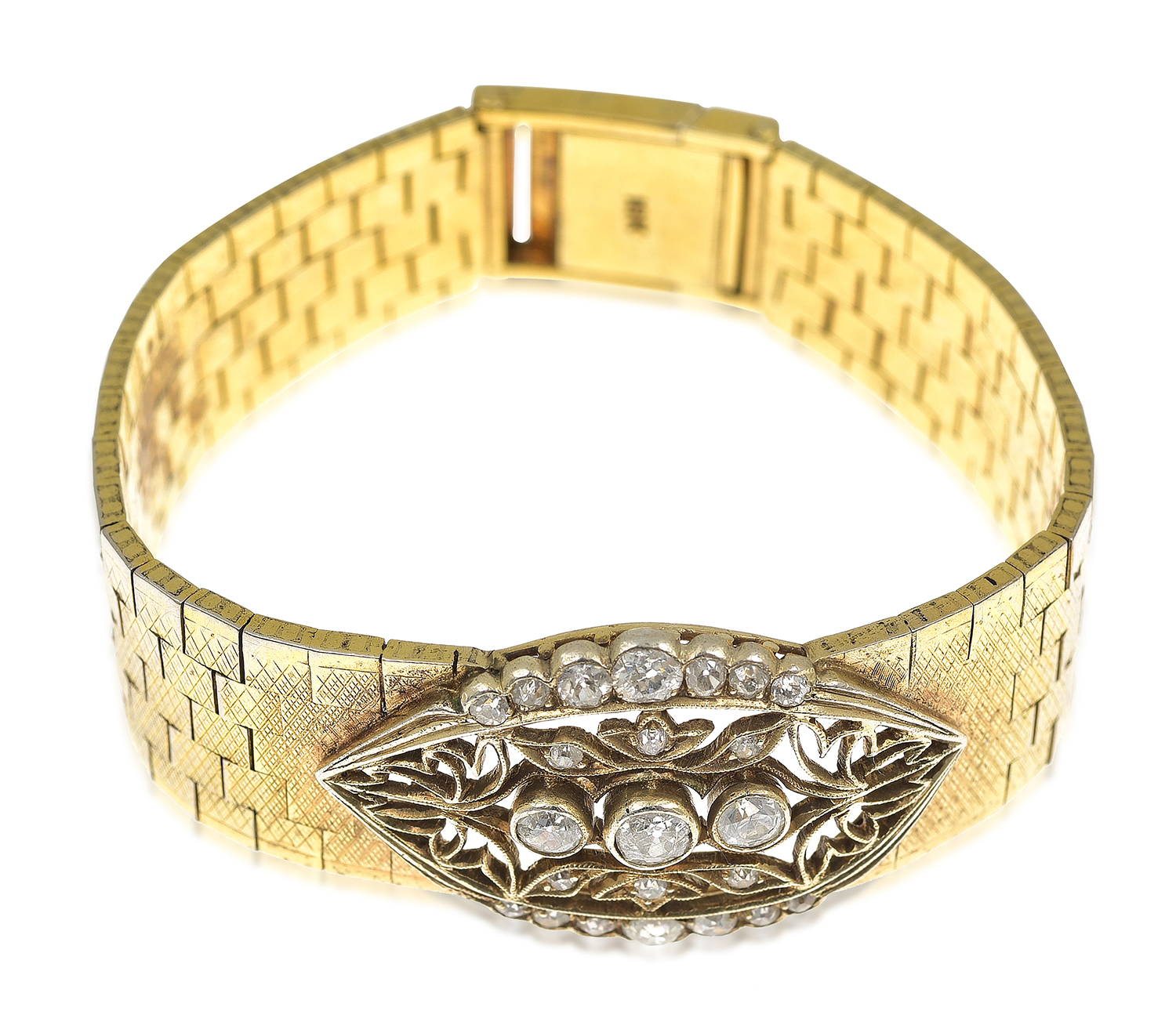Featuring pierced openwork set with early round brilliant cut diamonds to brick link panelling, mounted in 18ct gold, total length 155mm.