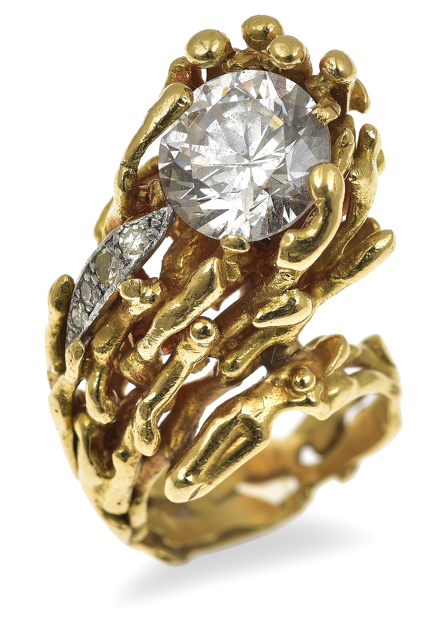 Of textured and sculpted design, set with a round brilliant cut cubic zirconia and offset by diamond detail, mounted in 18ct gold, signed, ring size H.