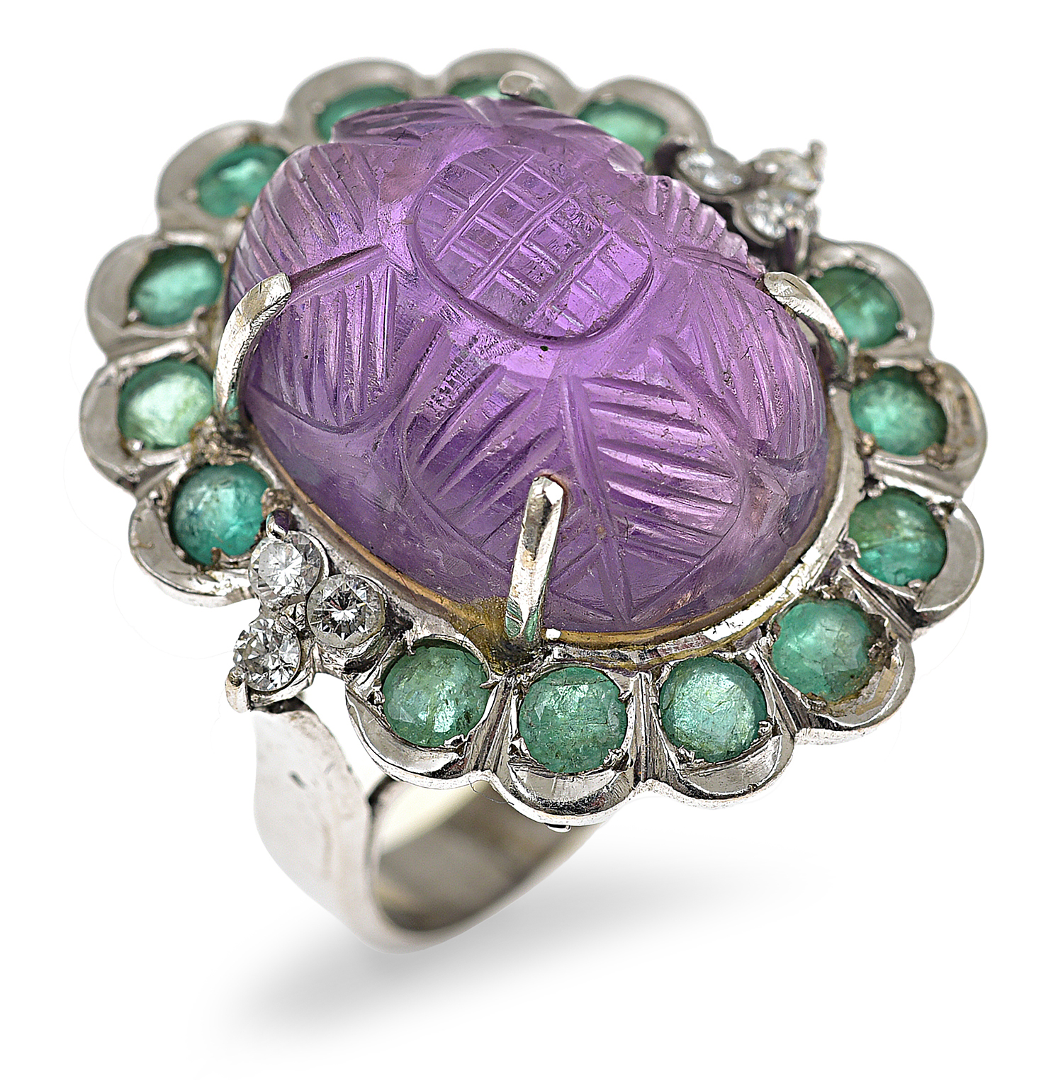 The carved oval amethyst cut en cabochon, having a trefoil of diamonds to each shoulder and surrounded by round cut emeralds, mounted in white gold, ring size N-O