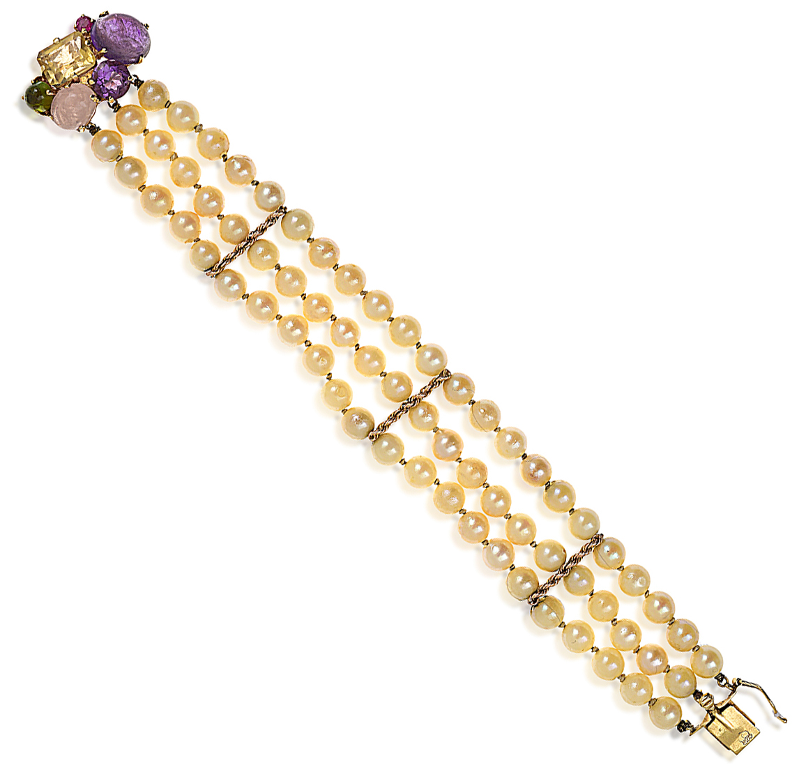 The triple row of round pearls of cream hue measuring 6.70mm, having three rope twist gold spacers and finished with a clasp set with mixed cut peridot, ruby, rose quartz, citrine and amethyst, mounted in 14ct gold, total length 180mm.