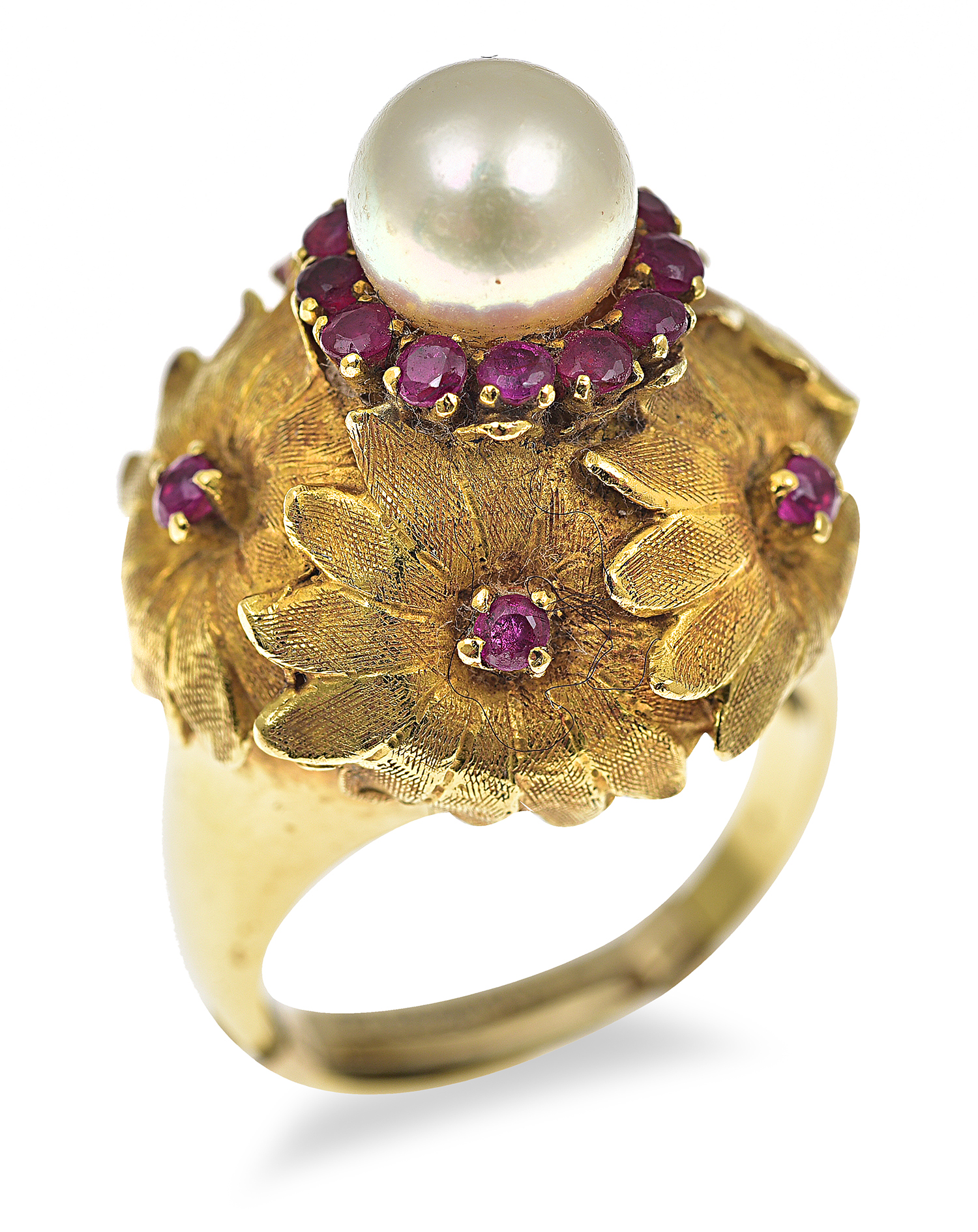 Centrally set with a cultured pearl surrounded by rubies, having five floral panels with further ruby detail mounted in 18ct gold, ring size L.