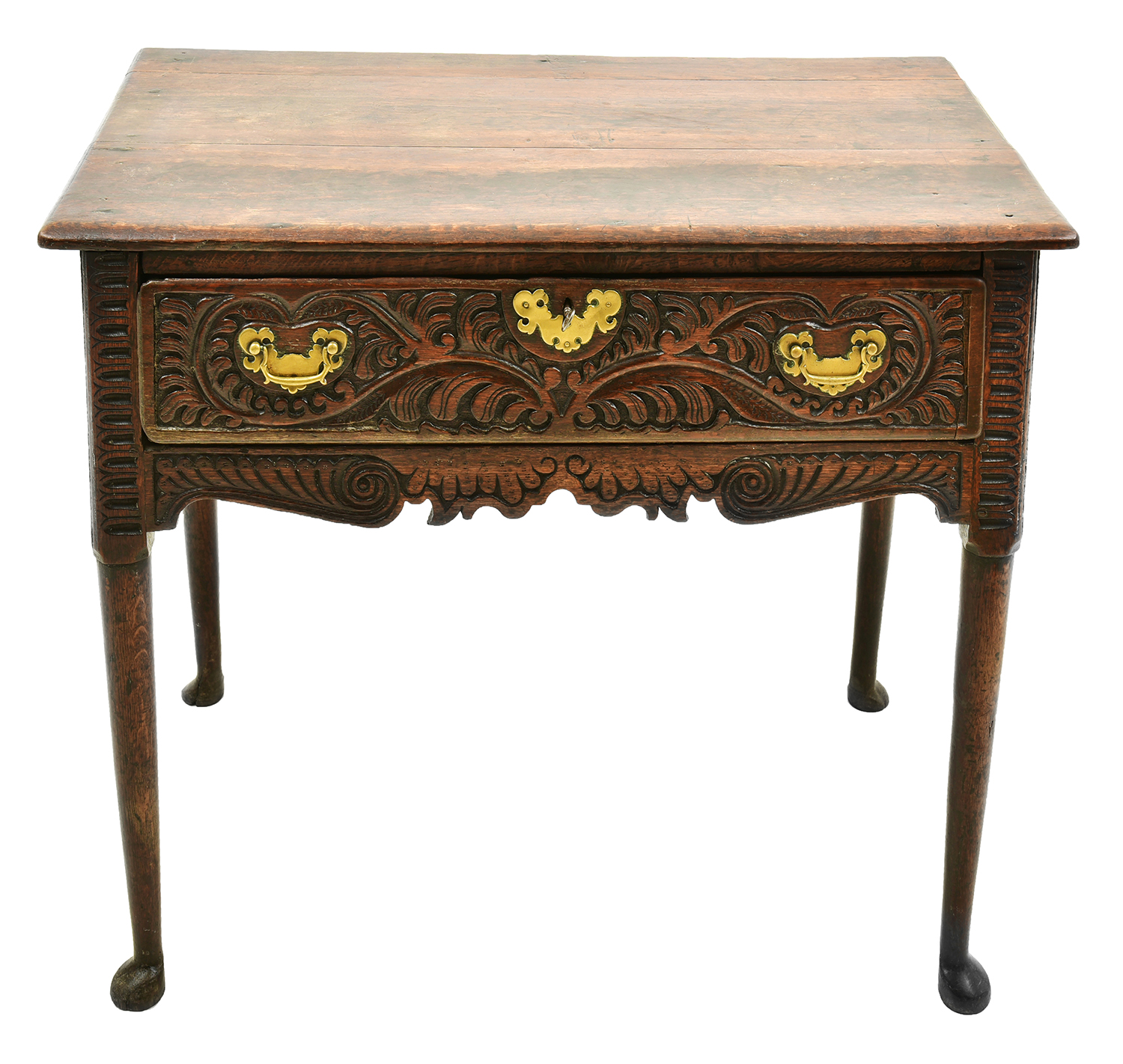 rectangular, with a single drawer, the apron and drawer carved with an elaborate scroll work design, with original brass handles, on four tapering legs with pad feet, 76 x 94 x 56cm
