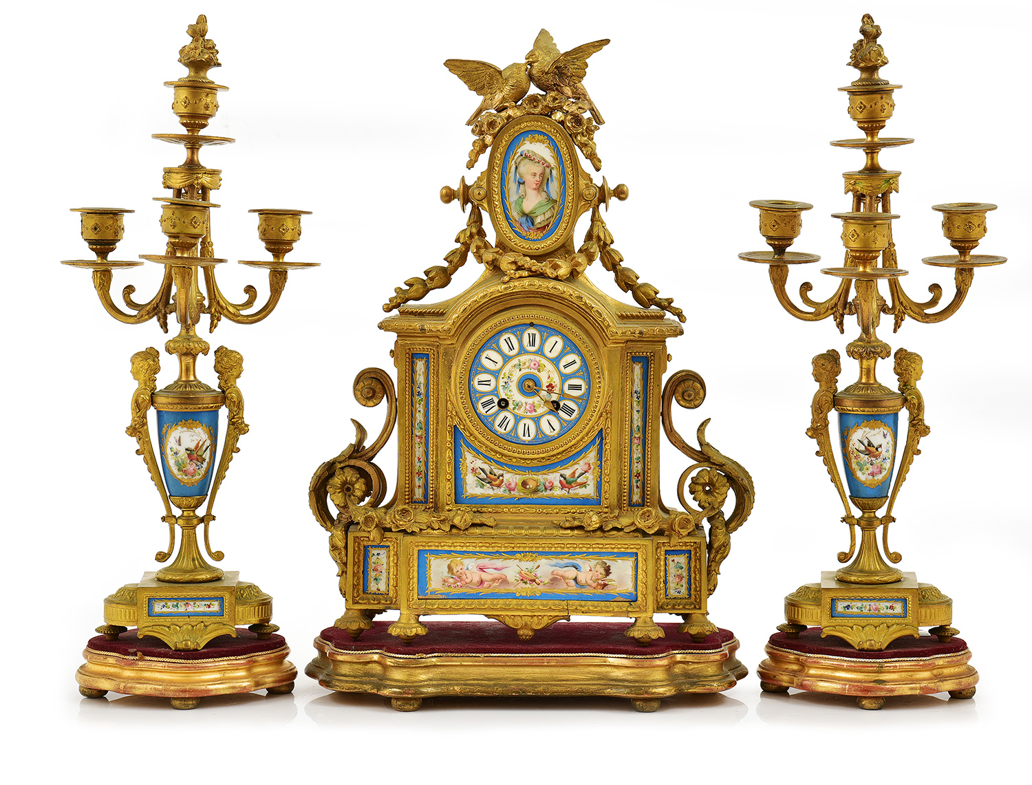 the clock featuring romantic scenes of cherubs & birds, with a central oval shaped portrait of a classical beauty, all inset into a gilt metal floral and scrollwork adorned case, surmounted by a double dove finial, accompanied by two matching candlesticks, each piece seated on a matching giltwood base, the clock and stand 49cm high