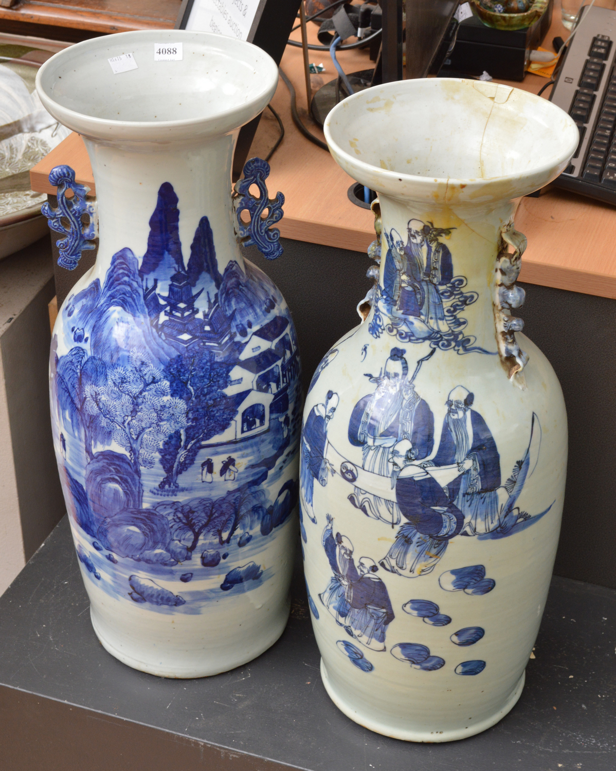 each vase baluster in form, one depicting a mountainous landscape scene; the other depicting the teachings of yin and yang, (one vase with extensive repairs), each vase 60 cm high