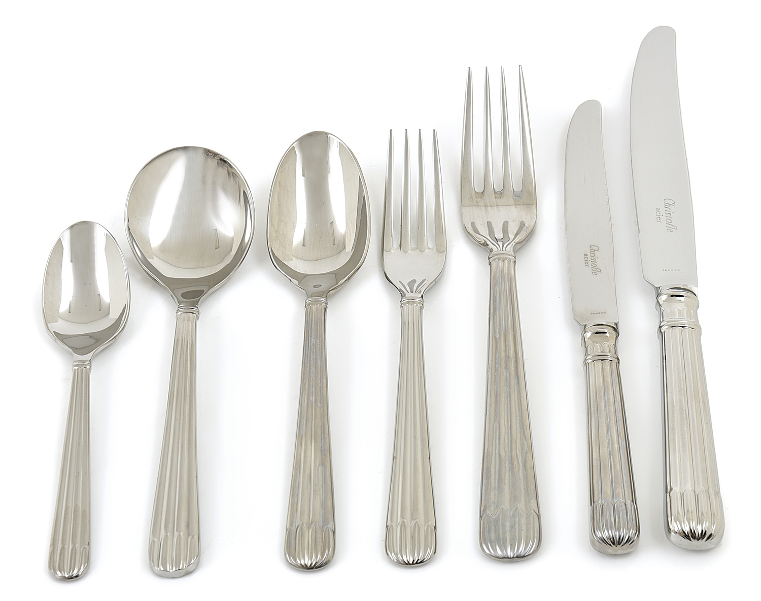 Comprising twelve dessert spoons, twelve teaspoons, twelve soup spoons, twelve entree forks, twelve dinner forks, twelve entree knives and twelve dinner knives, all housed in original cardboard packaging