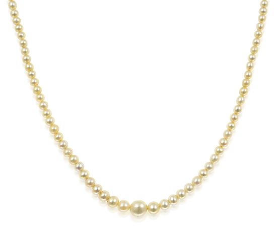 The graduated round pearls of cream hue measuring 2.80mm to 6.40mm, to a rose gold barrel clasp, total length 470mm.