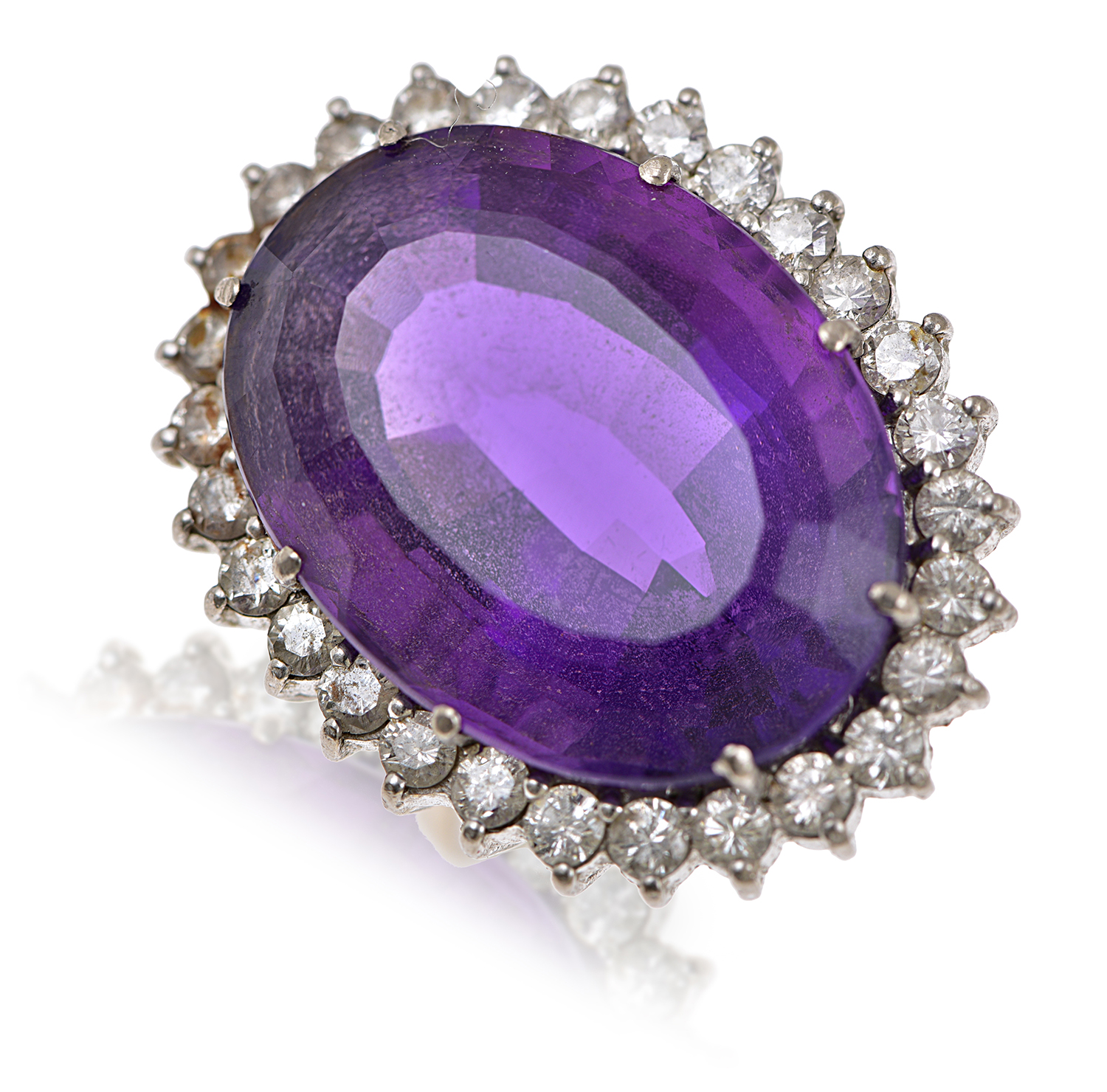 The oval cut amethyst of 21.35cts having thirty round brilliant cut diamonds set to the surround, mounted in 18ct white gold, ring size N.