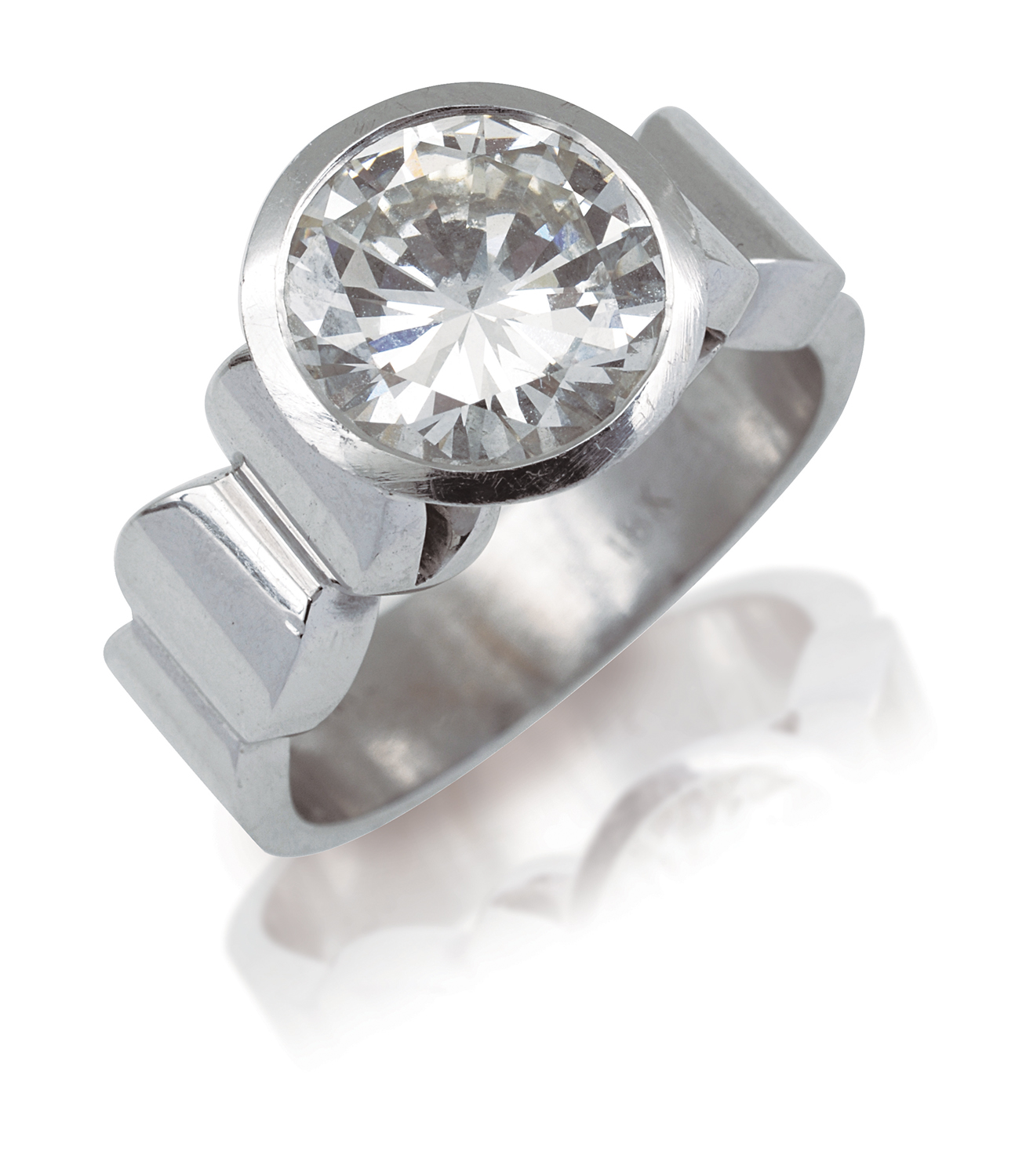 The round brilliant cut diamond of 3.10cts, bezel set, mounted in 18ct white gold, ring size O.