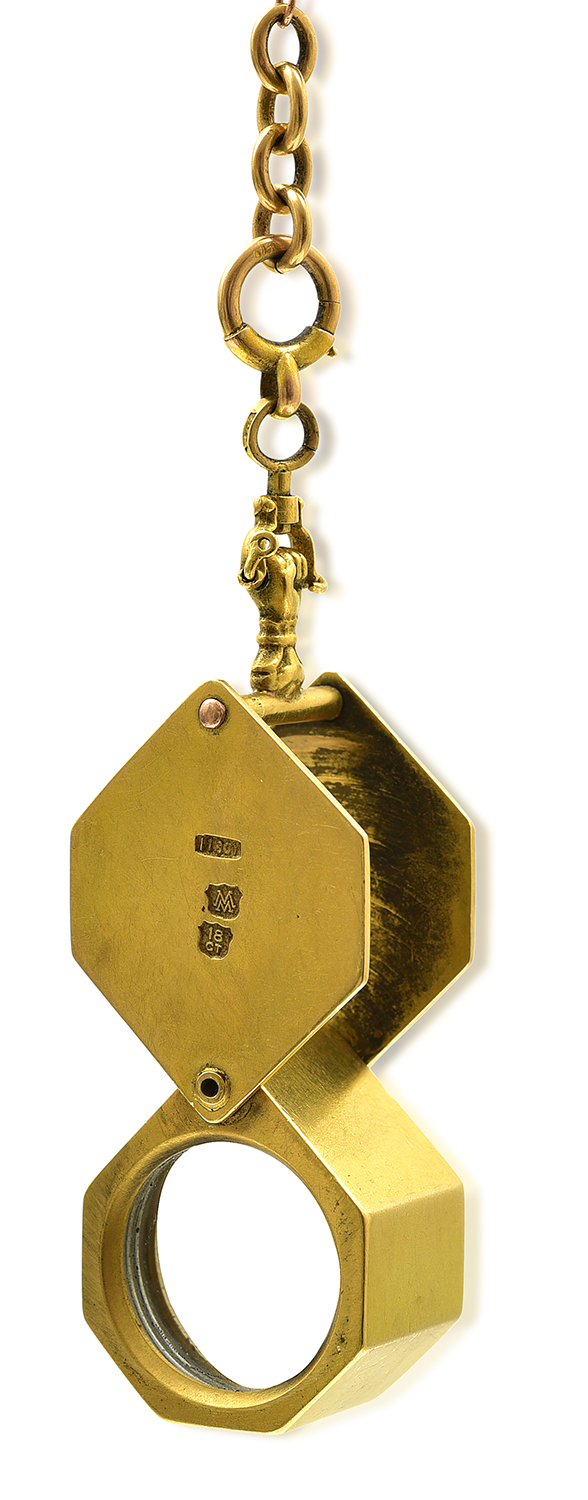 Stamped 18ct and makers mark MM on both sides of the cover and the loupe itself, fob chain stamped 15ct and t-bar stamped 18ct gold, Total weight of piece 102.5gms.