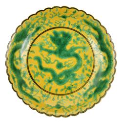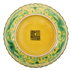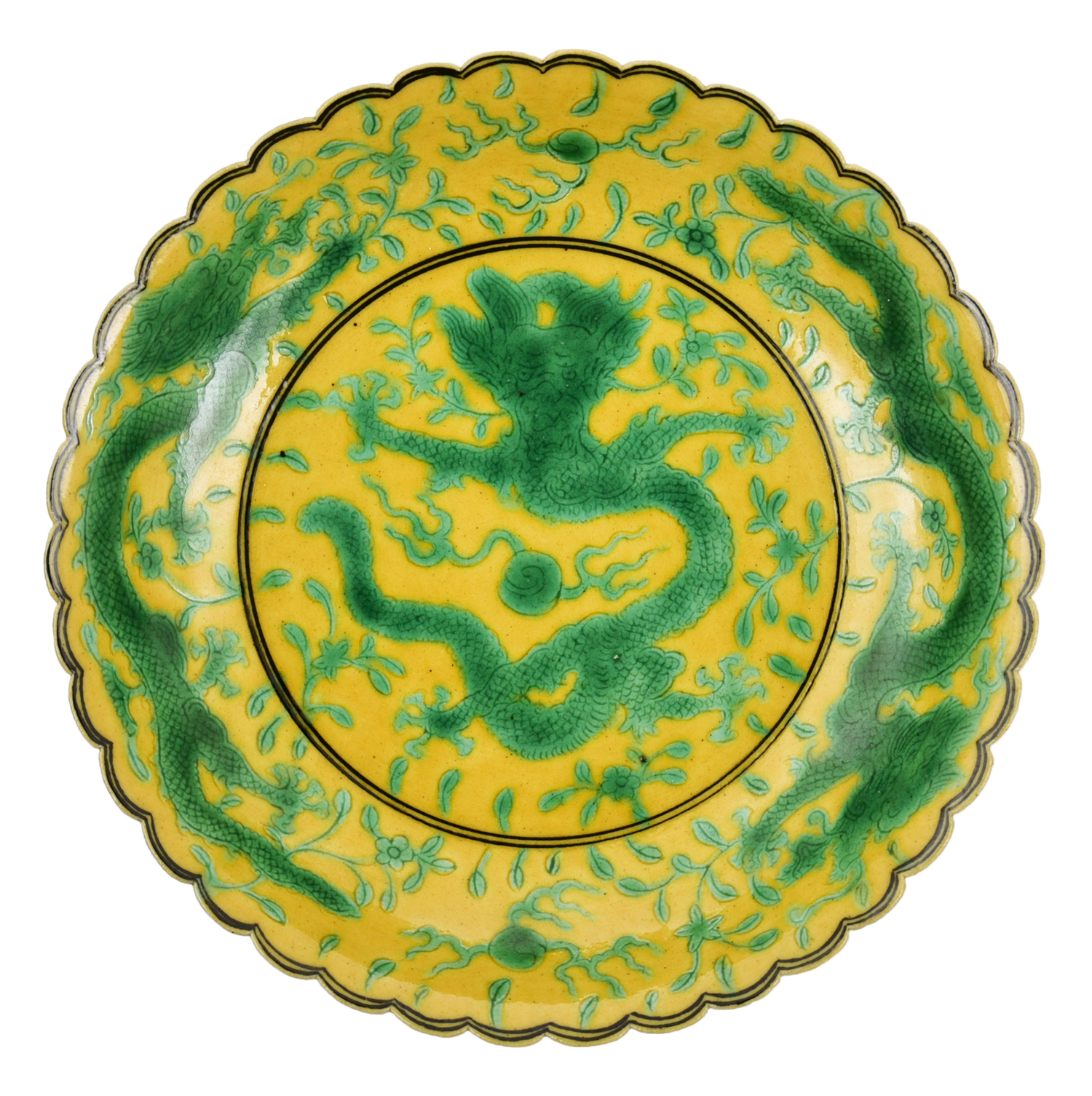 shallow and circular with a scalloped rim, green enamelled dragon chasing flaming pearl motif to interior and exterior on a yellow ground, Qianlong character mark to base, not of the period, 13.5cm diameter