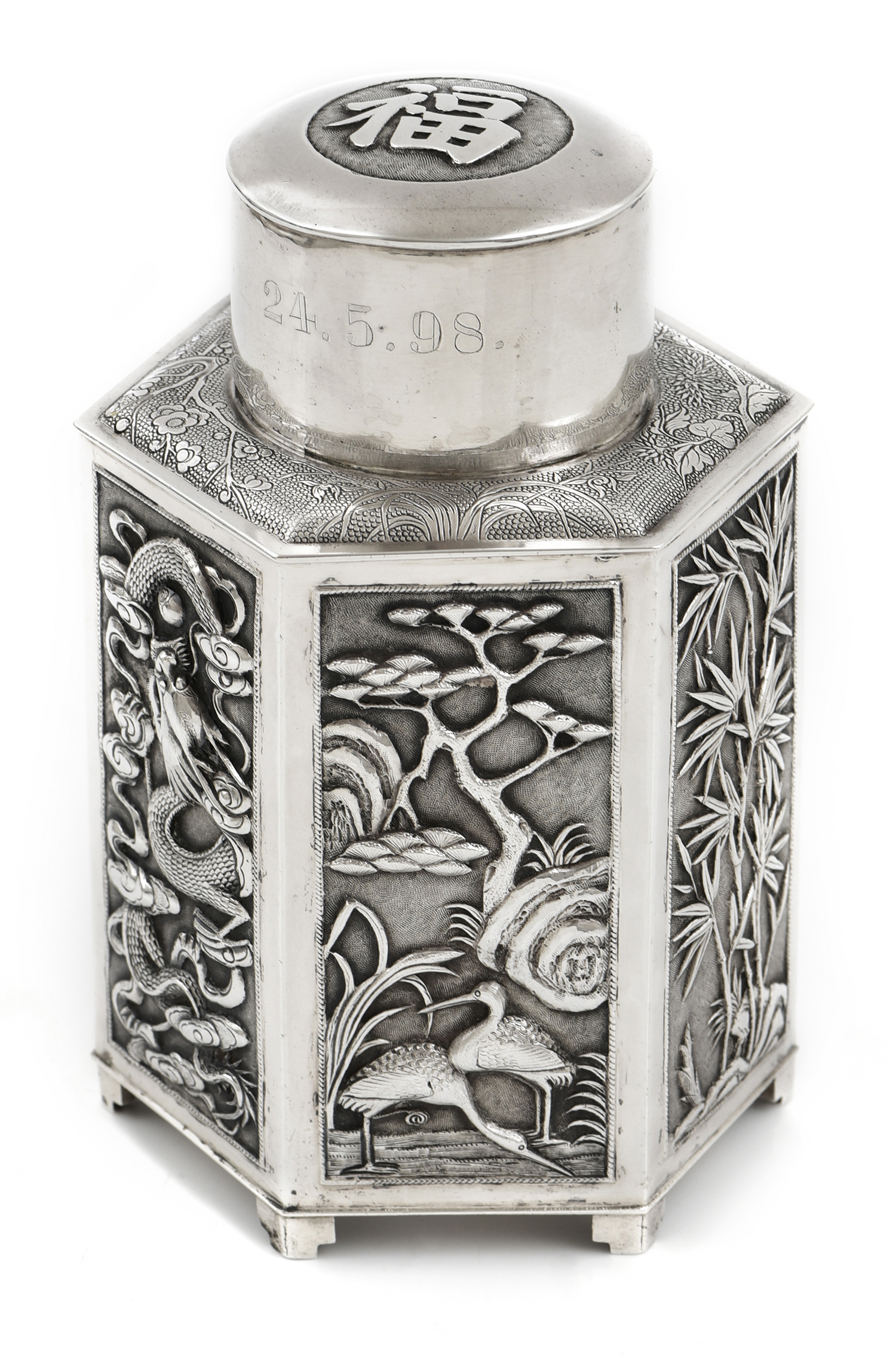 hexagonal in form, each side embossed with an auspicious scene, approximately 242 gms, dated 24.5.98 to lid, approximately 244 gms, 13.5 cm high