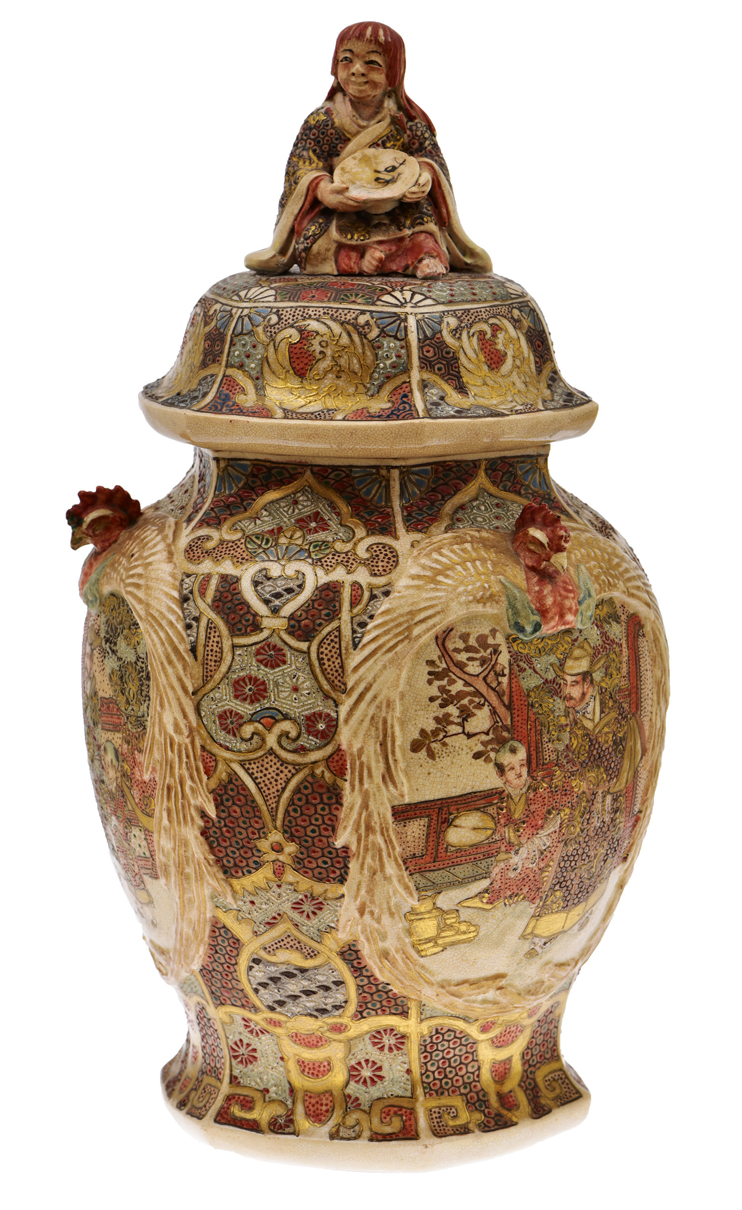hexagonal, applied floral moriage decoration, with three cockerel mounts, their extended wings framing three samurai scenes, below a flared lid with a figural finial, 26.5cm high