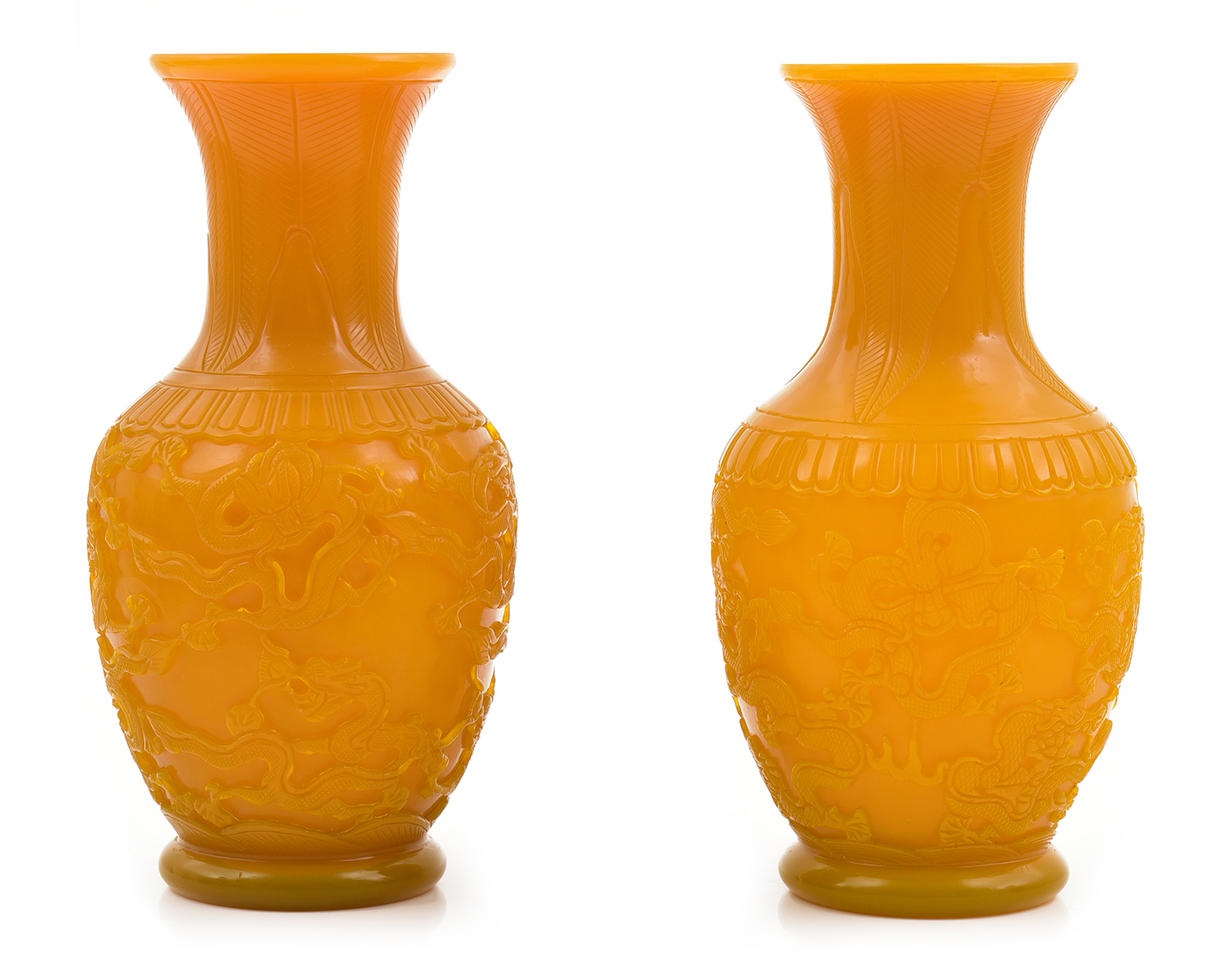 A SIMILAR PAIR OF YELLOW PEKING GLASS VASES