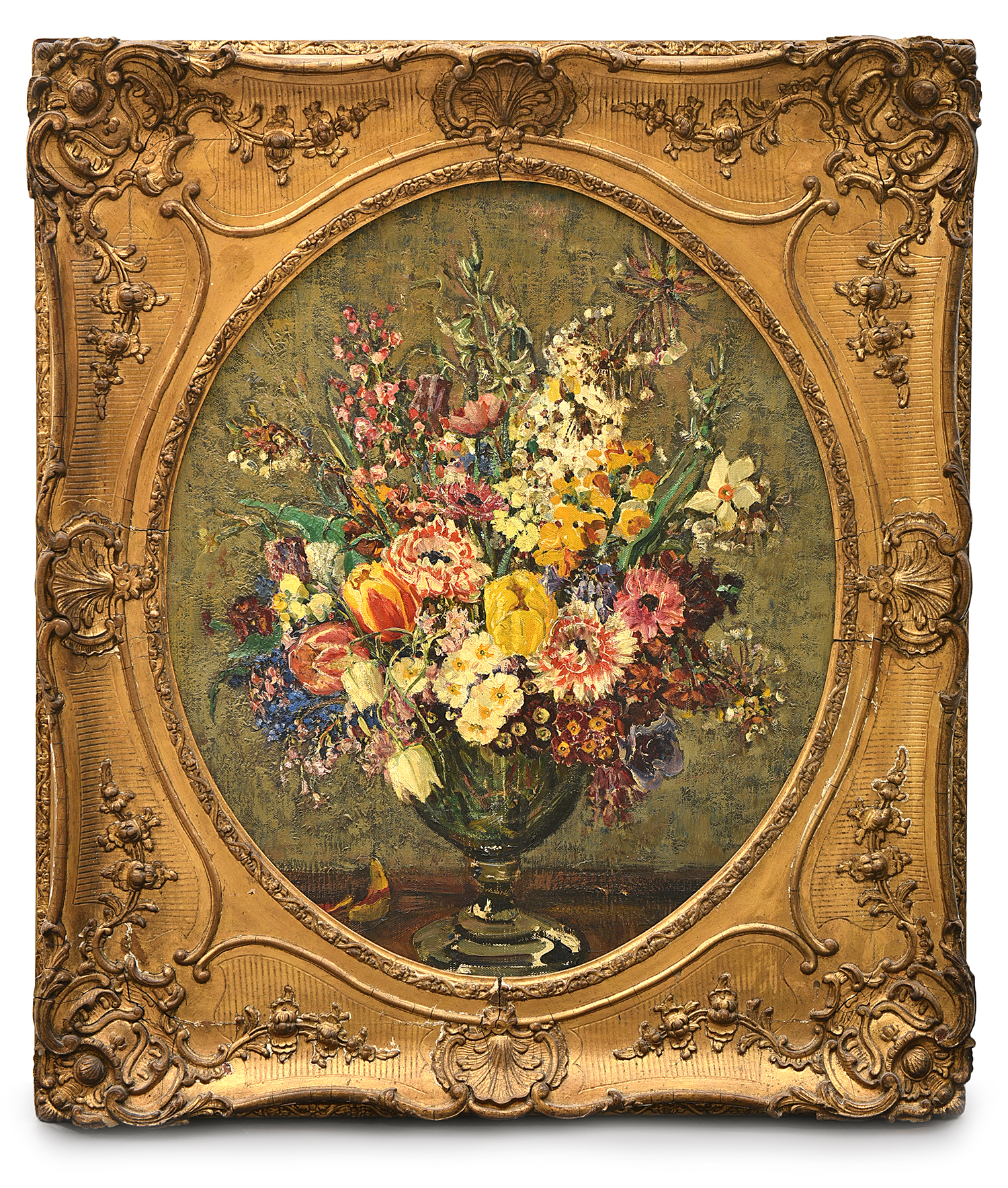 A STILL LIFE - A DISPLAY OF FLOWERS IN A GLASS VASE