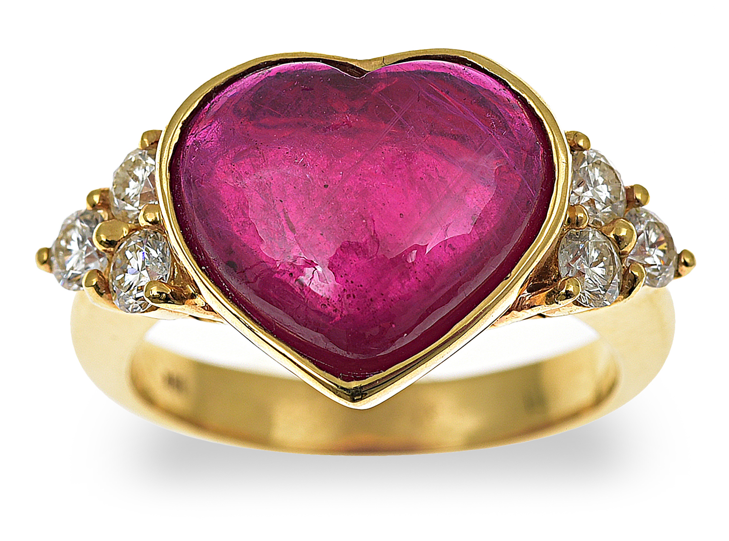 The heart shaped ruby cut en cabochon, having a trefoil of round brilliant cut diamonds set to each shoulder, mounted in 18ct gold, ring size Q.