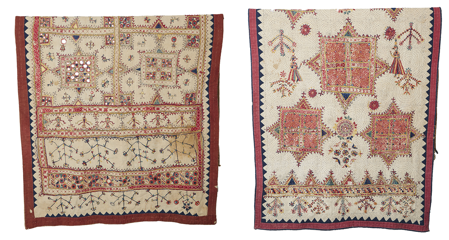 TWO RARE NORTHERN INDIAN GUJARAT EMBROIDERED AND MIRRORED WALL HANGINGS, 19TH/20TH CENTURY