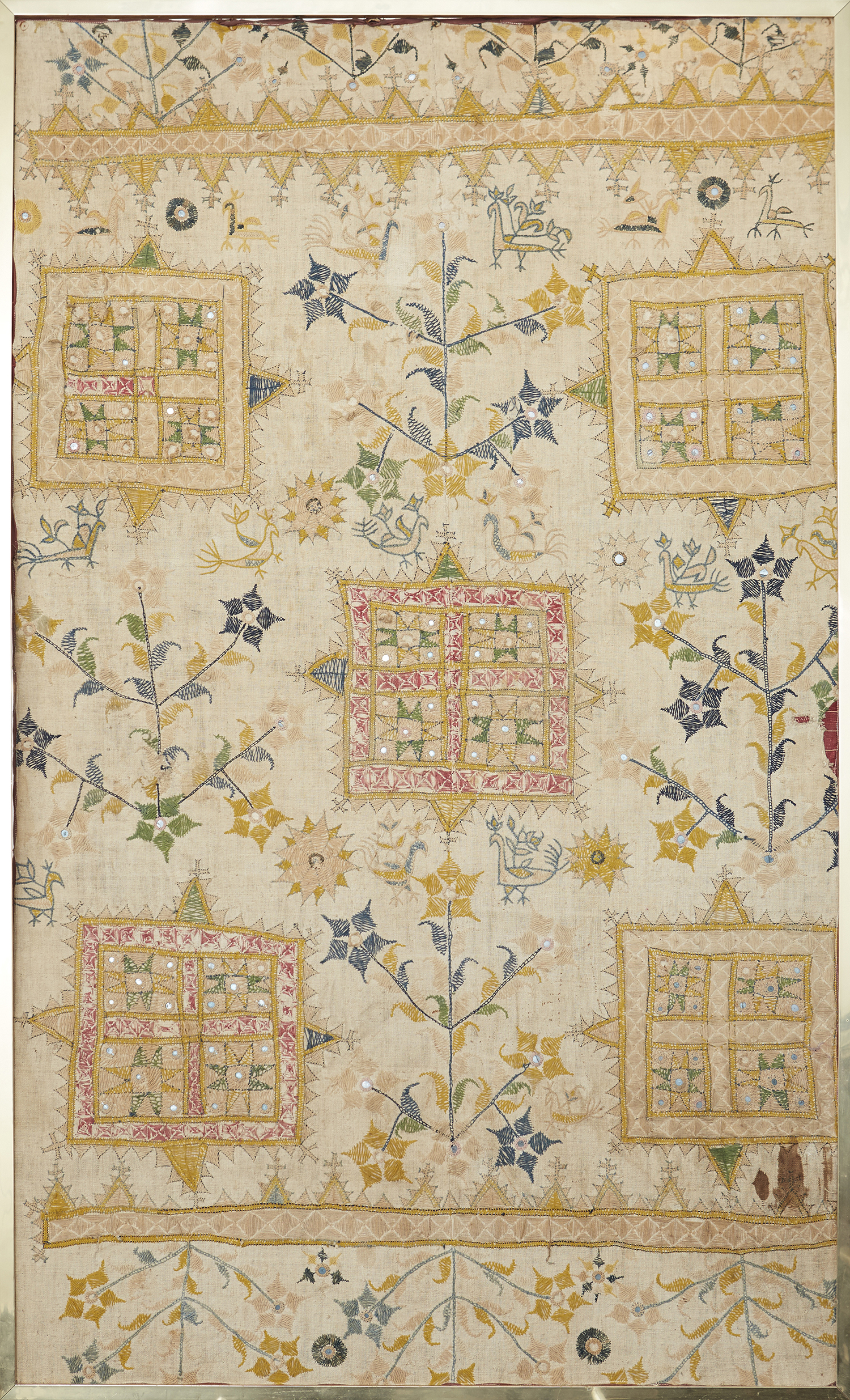 Embellished with embroidered and mirrored square panels amongst floral tendrils and birds, 147 x 88cm