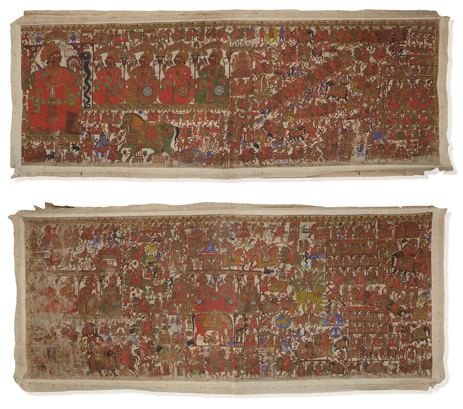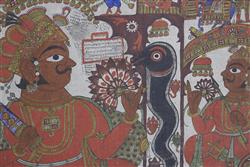 Ink and coloured pigment on cotton cloth, the central figure depicted as a princely Pabuji in various narrative scenes, an extensive depiction 782 x 145cm