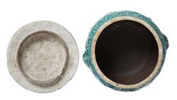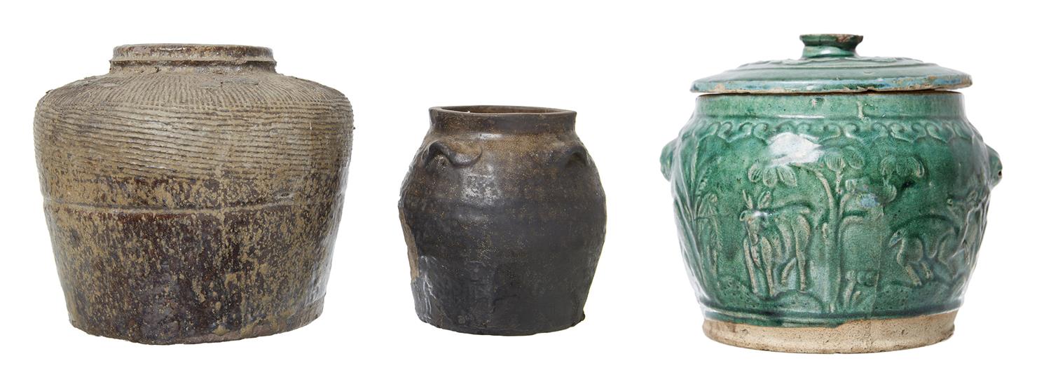 A CHINESE BLACK GLAZE JAR, POSSIBLY TANG, A LARGE STONEWARE JAR AND A SOUTHERN CHINESE POTTERY JAR AND COVER