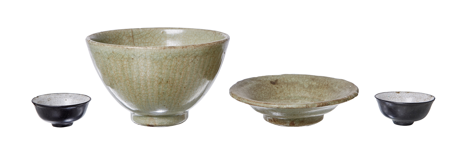 Together with two black glaze cups with seal mark and a celadon dish, bowl 13cm diameter, dish 12cm diameter, small cups 5.5cm diameter (4)