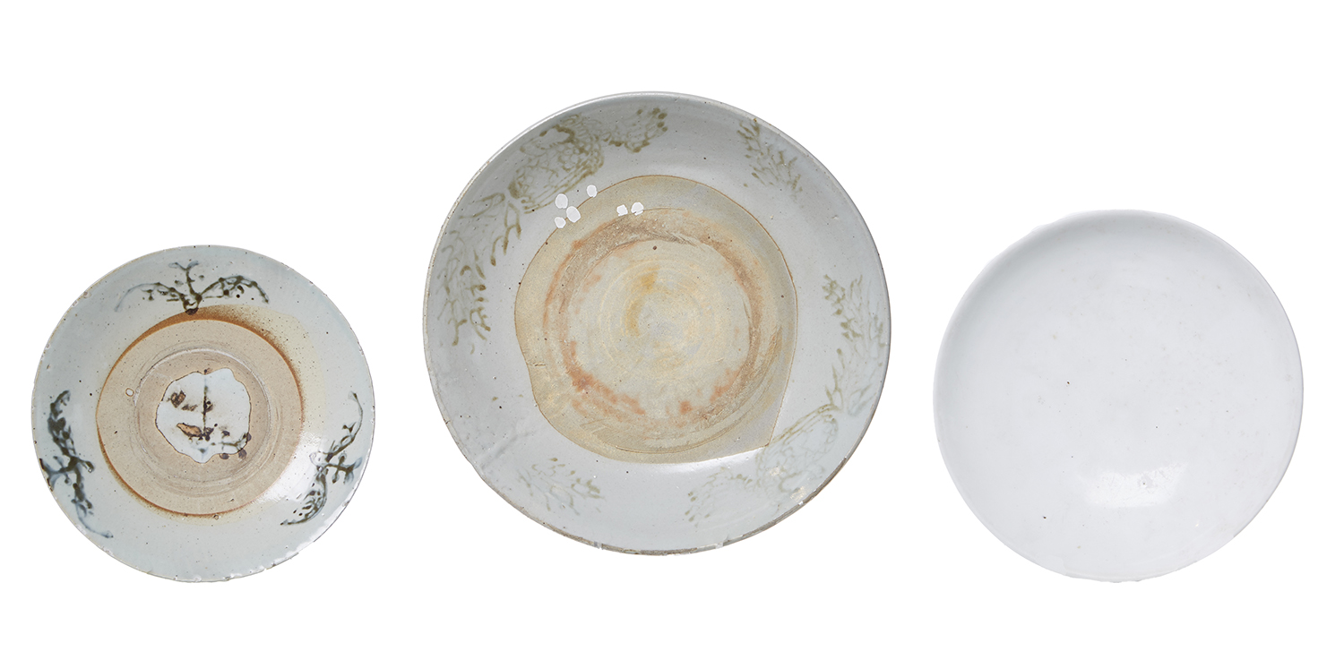 Comprising an early porcelain bow,l 25cm diameter, and two glazed pottery dishes, 27 and 19cm diameter (3)