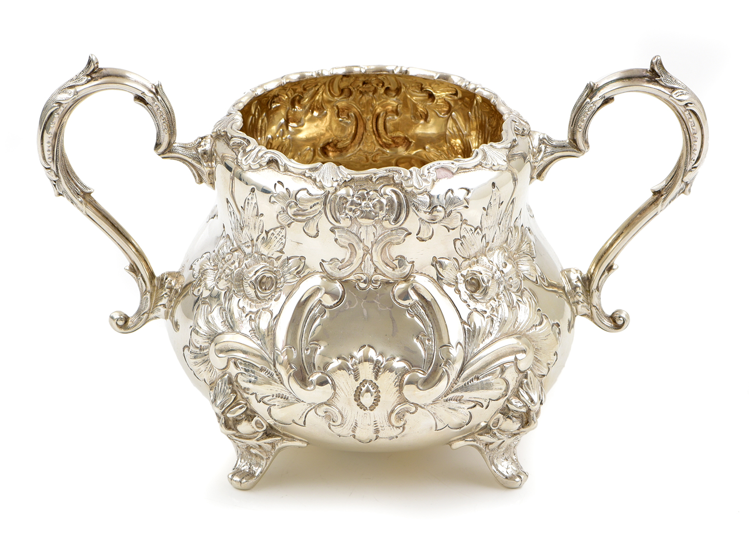 the bowl with a lobed lower body and overall floral embossed decoration, flanked by two scroll handles and supported by four figural scroll feet, 418 gms, 11.5cm high